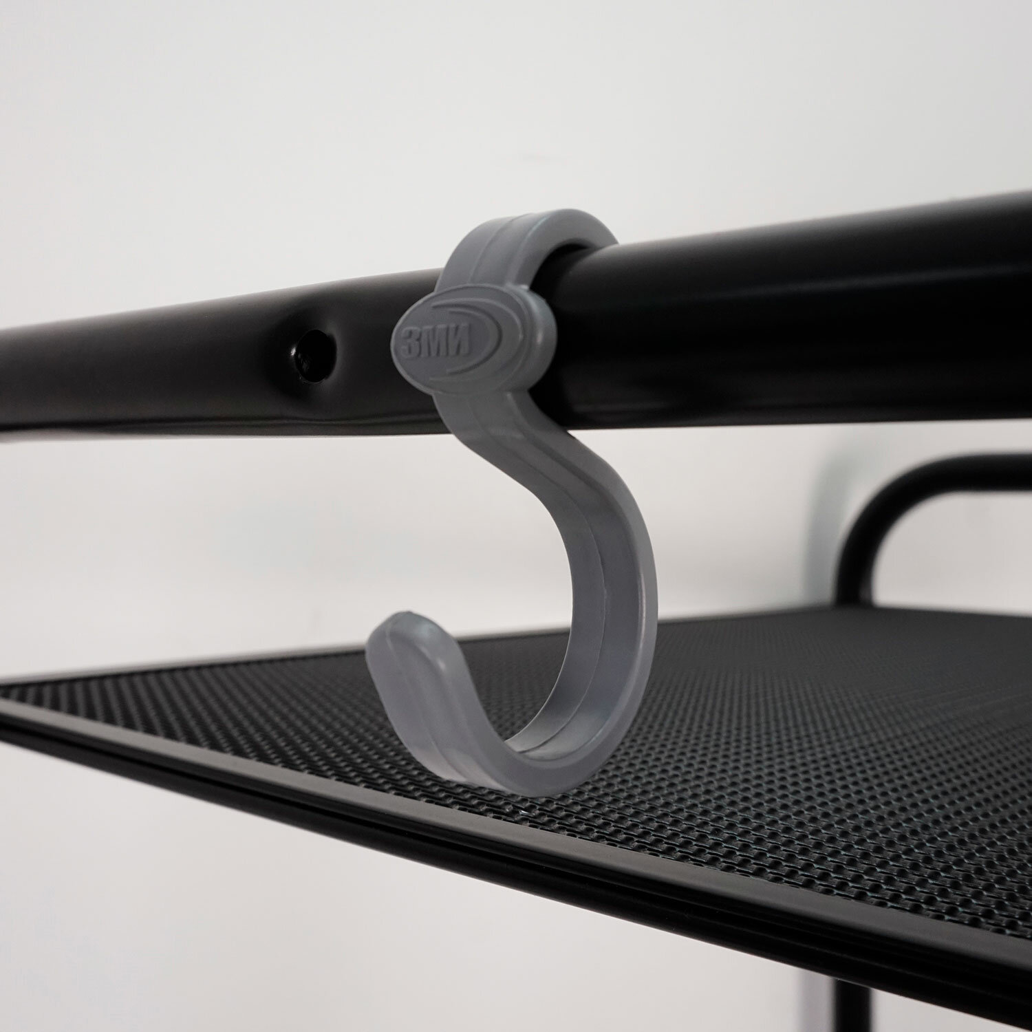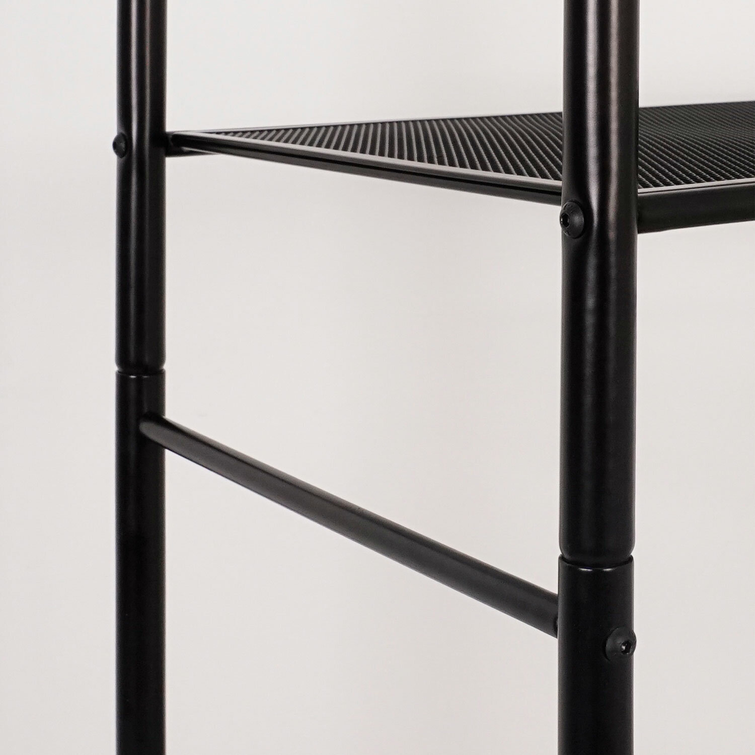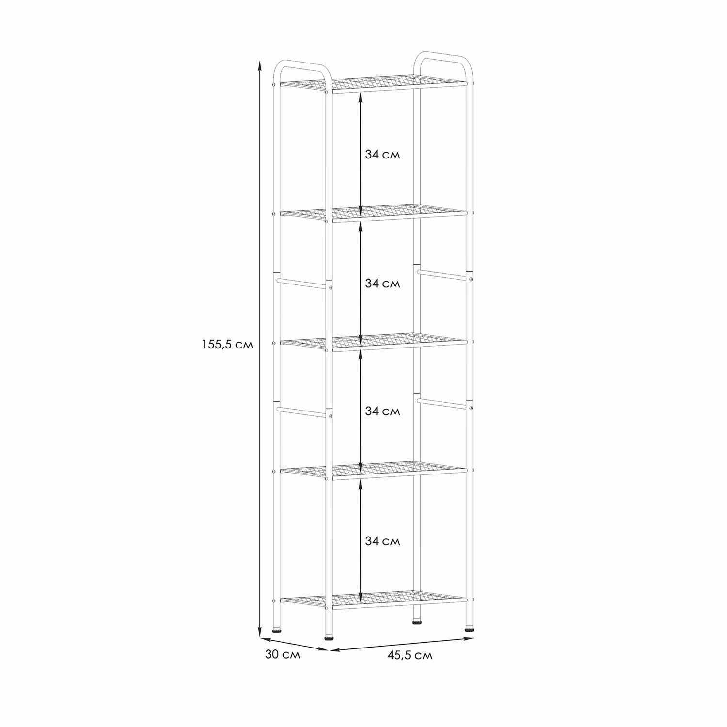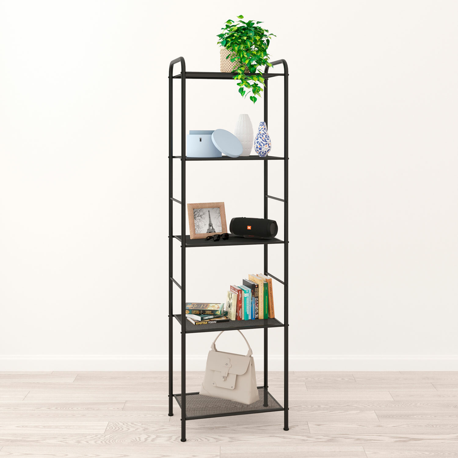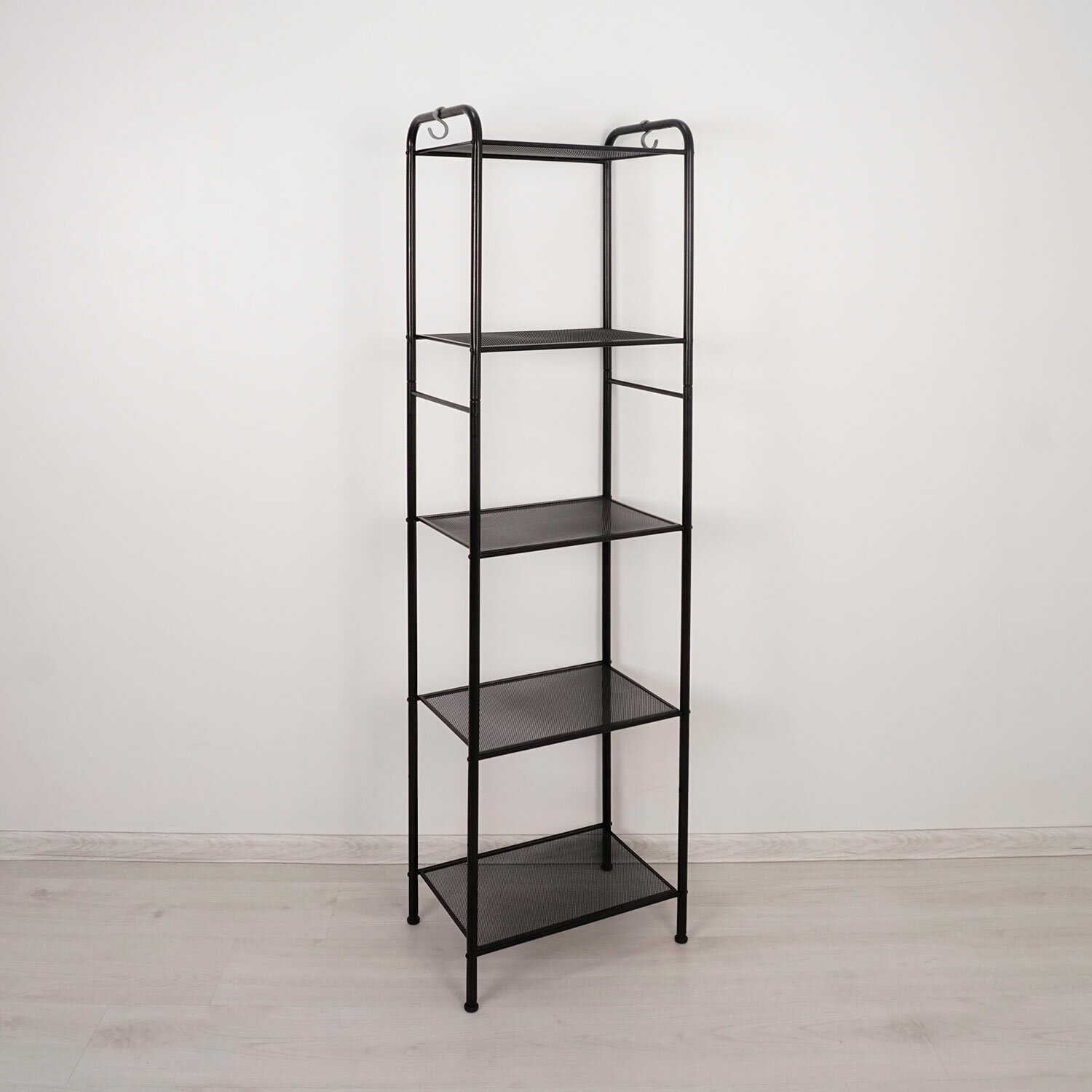 Стеллаж выполнен из прочной металлической трубы диаметром 25 мм и стального листа в мелкую сетку.Пять прочных широких металлических полок.Нагрузка на одну полку – до 8 кг.Два пластиковых декоративных крючка для мелочей.На ножках установлены пластиковые регулируемые опоры.Предусмотрено надежное крепление к стене.Изделие поставляется в разобранном виде в красочной картонной коробке с ручкой.Простая сборка согласно инструкции, шестигранный ключ для сборки в комплекте.
