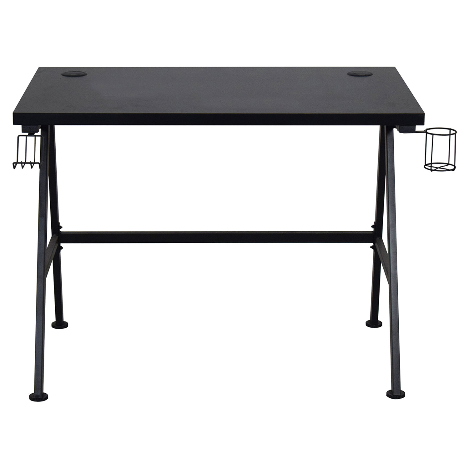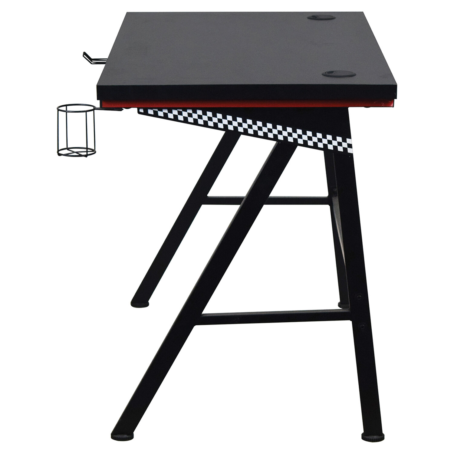 Прочный каркас, обеспечивающий устойчивость, выполнен из металла с матовым покрытием и сечением 20х40 мм.Интересным акцентом являются контрастные детали, подчеркивающие геймерский стиль стола.Столешница изготовлена из высококачественной ДСП толщиной 15 мм. Имеет вырезы в задней части для удобного размещения проводов. Максимальная нагрузка на столешницу – до 50 кг. Для поддержания порядка на рабочей поверхности стол оборудован держателями для кружки и наушников. Ножки оснащены накладками, которые защищают пол от повреждений.