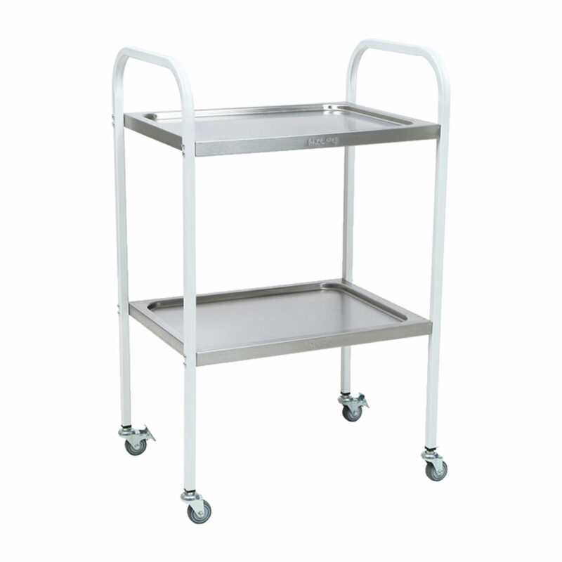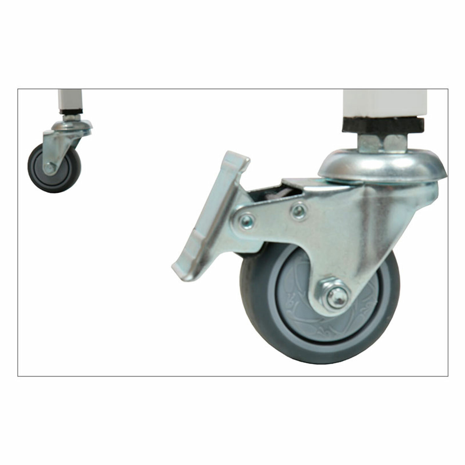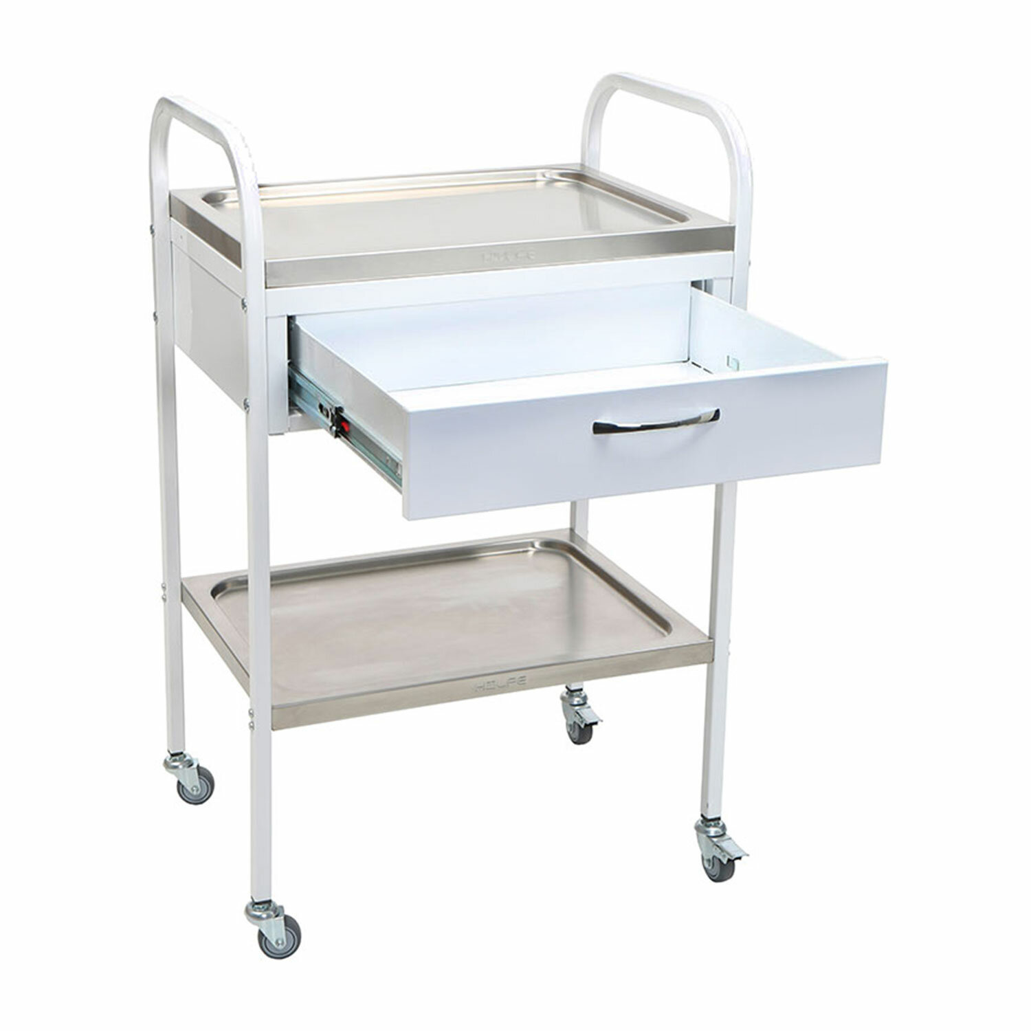 Каркас стола изготовлен из профильной трубы квадратного сечения 20х20 мм, покрытой эпоксидно-порошковой краской,полки изготовлены из нержавеющей стали 1,0 мм методом прессовой вытяжки.Поверхность стола устойчива к ударам, сколам, средствам дезинфекционной обработки способом протирания.Стол манипуляционный имеет 4 колеса из немаркой резины (D = 50 мм), два колеса снабжены тормозом.Нагрузка на полку — не более 15 кг.Нагрузка на ящик — не более 15 кг.Поставляется в разобранном виде.