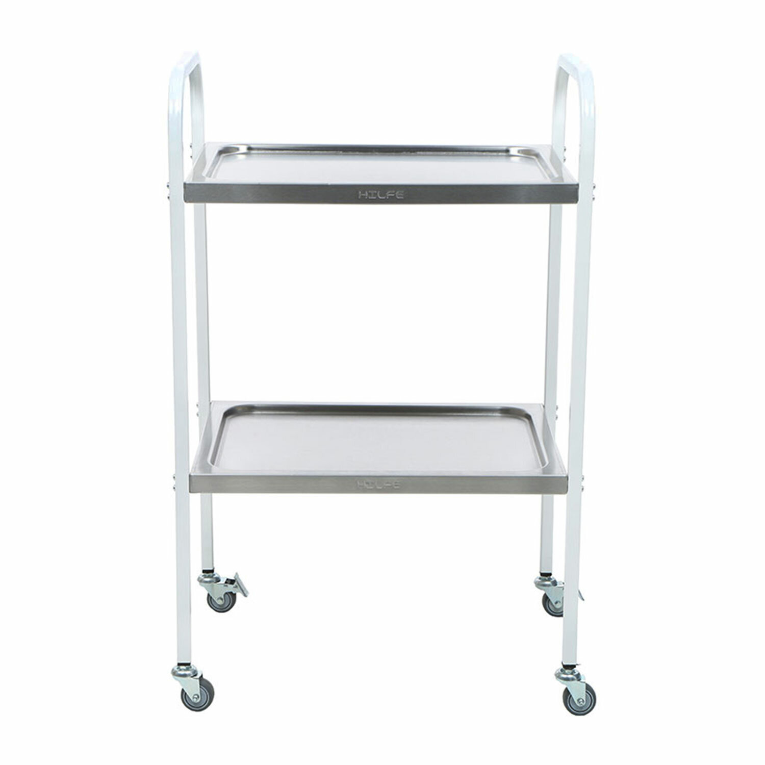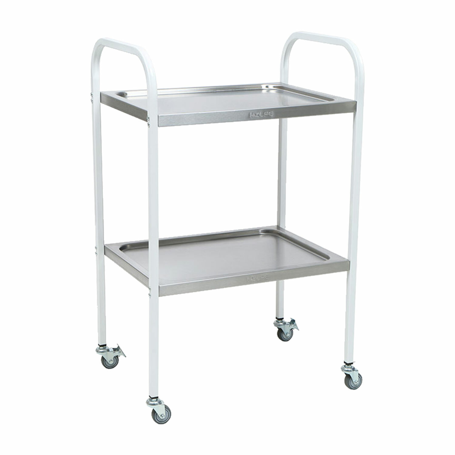 Каркас стола изготовлен из профильной трубы квадратного сечения 20х20 мм, покрытой эпоксидно-порошковой краской,полки изготовлены из нержавеющей стали 1,0 мм методом прессовой вытяжки.Поверхность стола устойчива к ударам, сколам, средствам дезинфекционной обработки способом протирания.Стол процедурный имеет 4 колеса из немаркой резины (D= 50 мм), два колеса снабжены тормозом.Нагрузка на полку — не более 15 кг.Поставляется в разобранном виде.