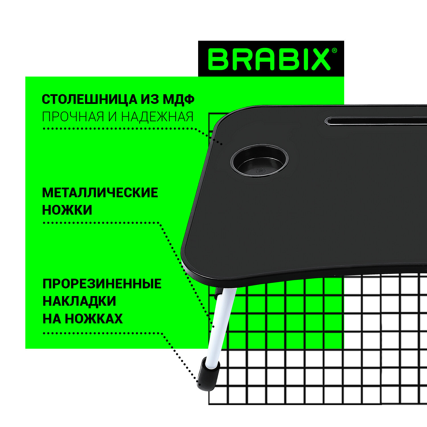 Столик для ноутбука BRABIX отлично подойдет для работы с ноутбуком лежа, для занятия творчеством, для завтрака в постели. Столик можно использовать в качестве полки. Также он станет полезным подарком для друзей, родственников и коллег.