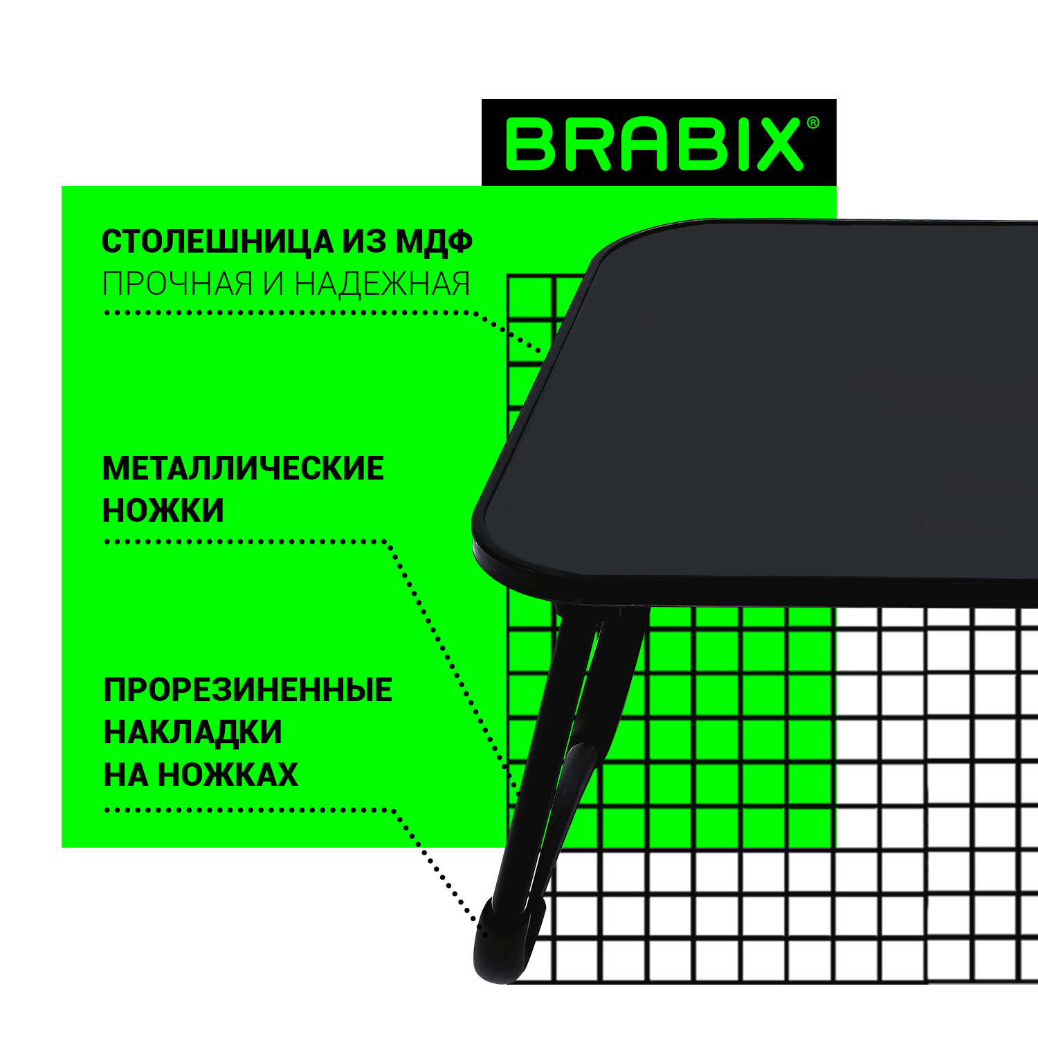 Столик для ноутбука BRABIX отлично подойдет для работы с ноутбуком лежа, для занятия творчеством, для завтрака в постели. Столик можно использовать в качестве полки. Также он станет полезным подарком для друзей, родственников и коллег.