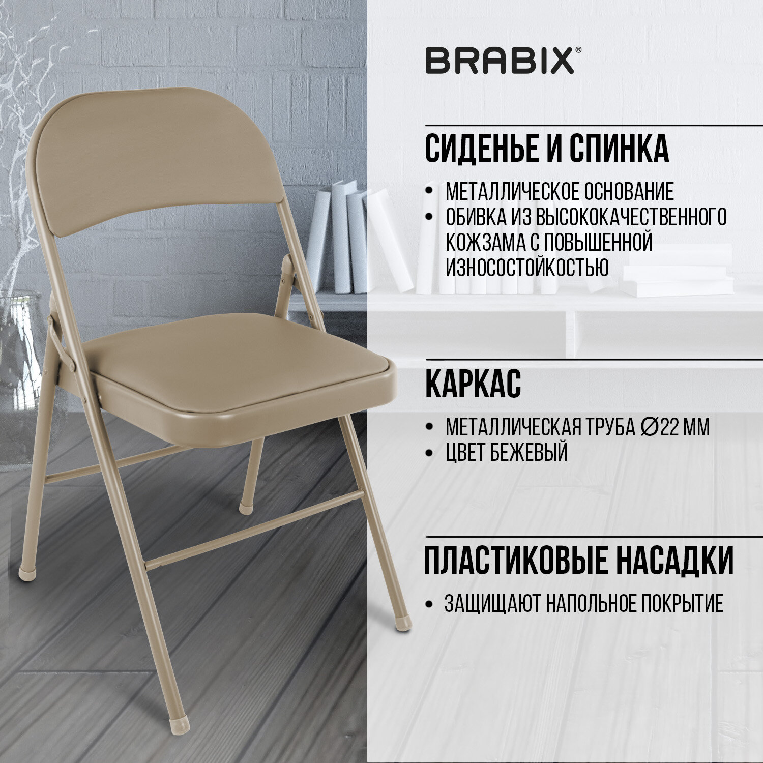 Материал обивки — качественный кожзаменитель повышенной износостойкости. Складная конструкция экономит место при перевозке и хранении. Прочная металлическая рама и металлическое основание сиденья обеспечивают долговечность эксплуатации, а пластиковые насадки на ножках защищают напольное покрытие от повреждений. В набивке спинки и сиденья использован поролон высокой плотности. Стул выдерживает нагрузку до 110 кг. Для дополнительной сохранности он упакован в индивидуальную картонную коробку.