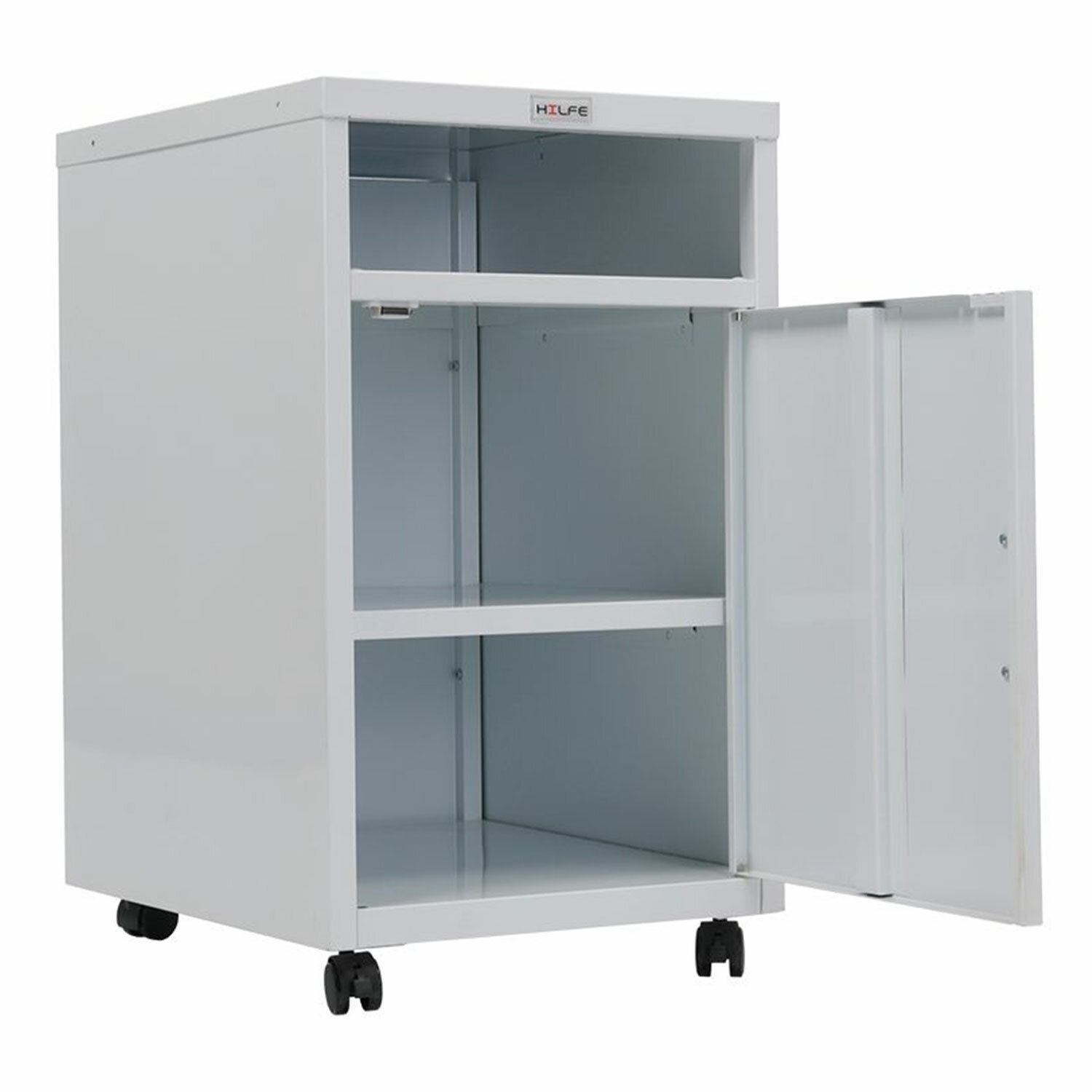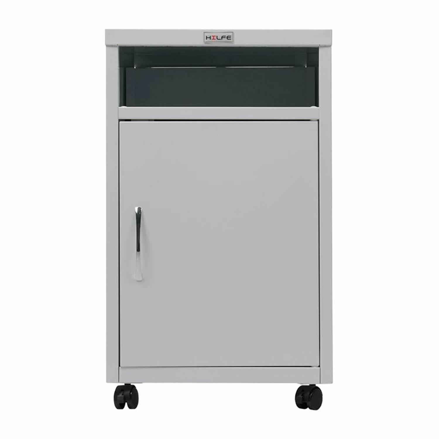 Тумба изготовлена из стали, толщина корпуса — 0,6 мм, толщина двери — 0,7 мм.Нагрузка на полку -15 кг.Оборудована колесами 50 мм, два передних снабжены стопором.Поставляется в разобранном виде.Высота с установленными колесами — 710 мм.