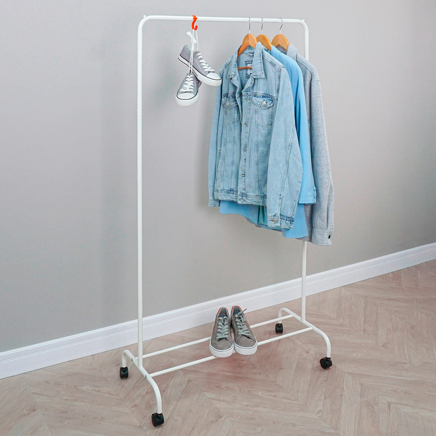 Многофункциональная мобильная вешалка для открытого хранения вещей дома, в офисе и зале магазина. Это не просто вешалка, это гардеробная система со штангой для плечиков, полкой для обуви и органайзеров, крючком для сумок, зонтов и других аксессуаров.