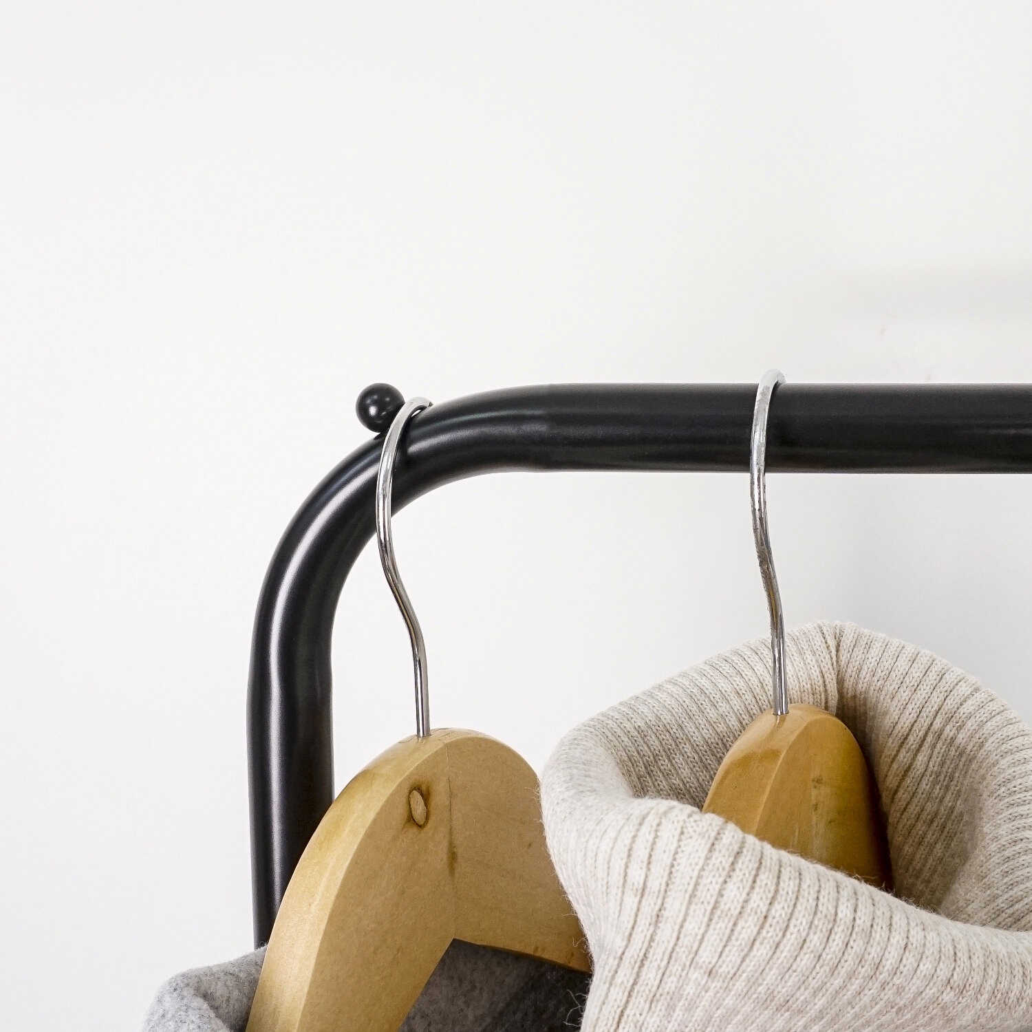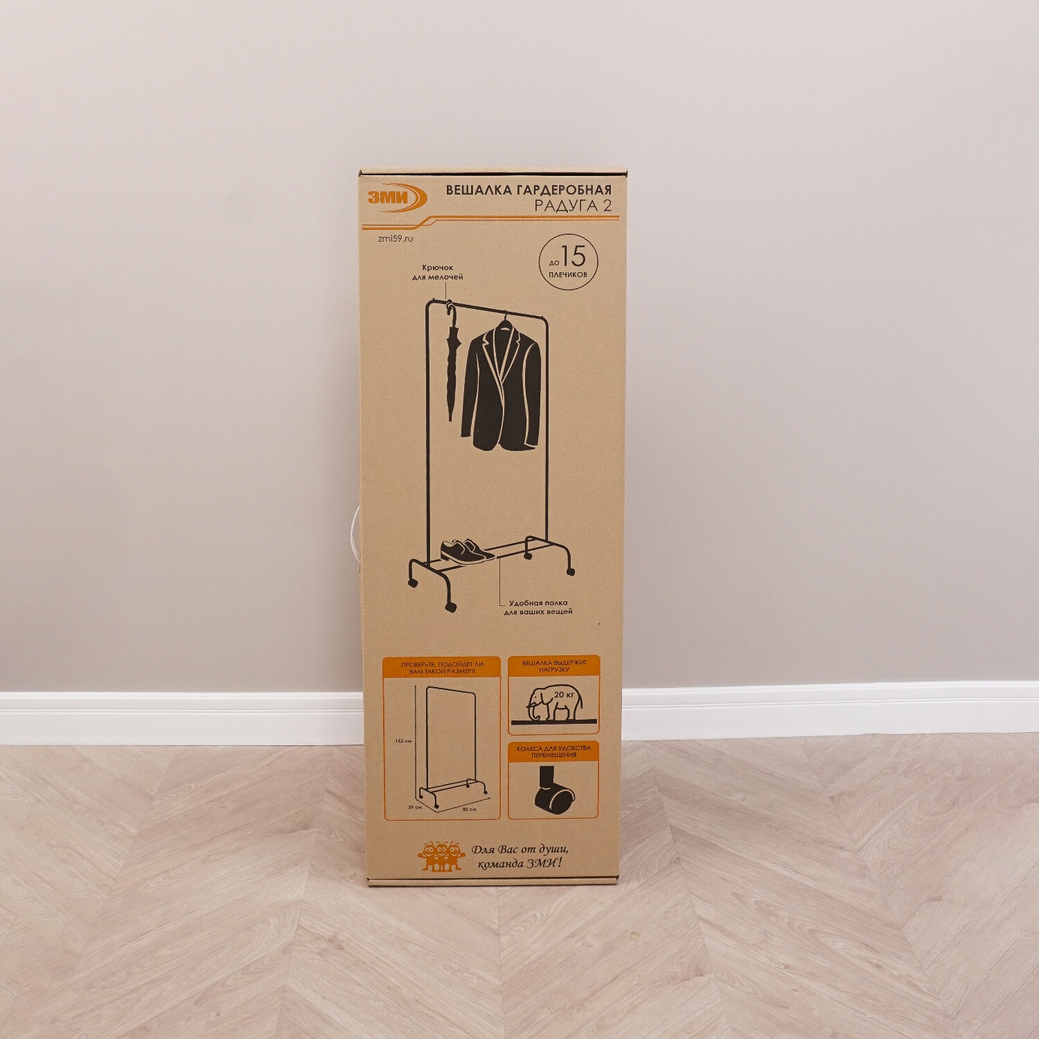 Каркас выполнен из стальной трубы диаметром 18 мм с полимерным покрытием.Железная перекладина способна разместить до 15 плечиков.Один съемный декоративный крючок для аксессуаров.Полка для размещения обуви, коробок или органайзеров.На ножках предусмотрены пластиковые поворотные роликовые опоры.Общая нагрузка на вешалку – до 20 кг.Изделие поставляется в разобранном виде в картонной коробке с ручкой.Простая сборка согласно инструкции, шестигранный ключ в комплекте.