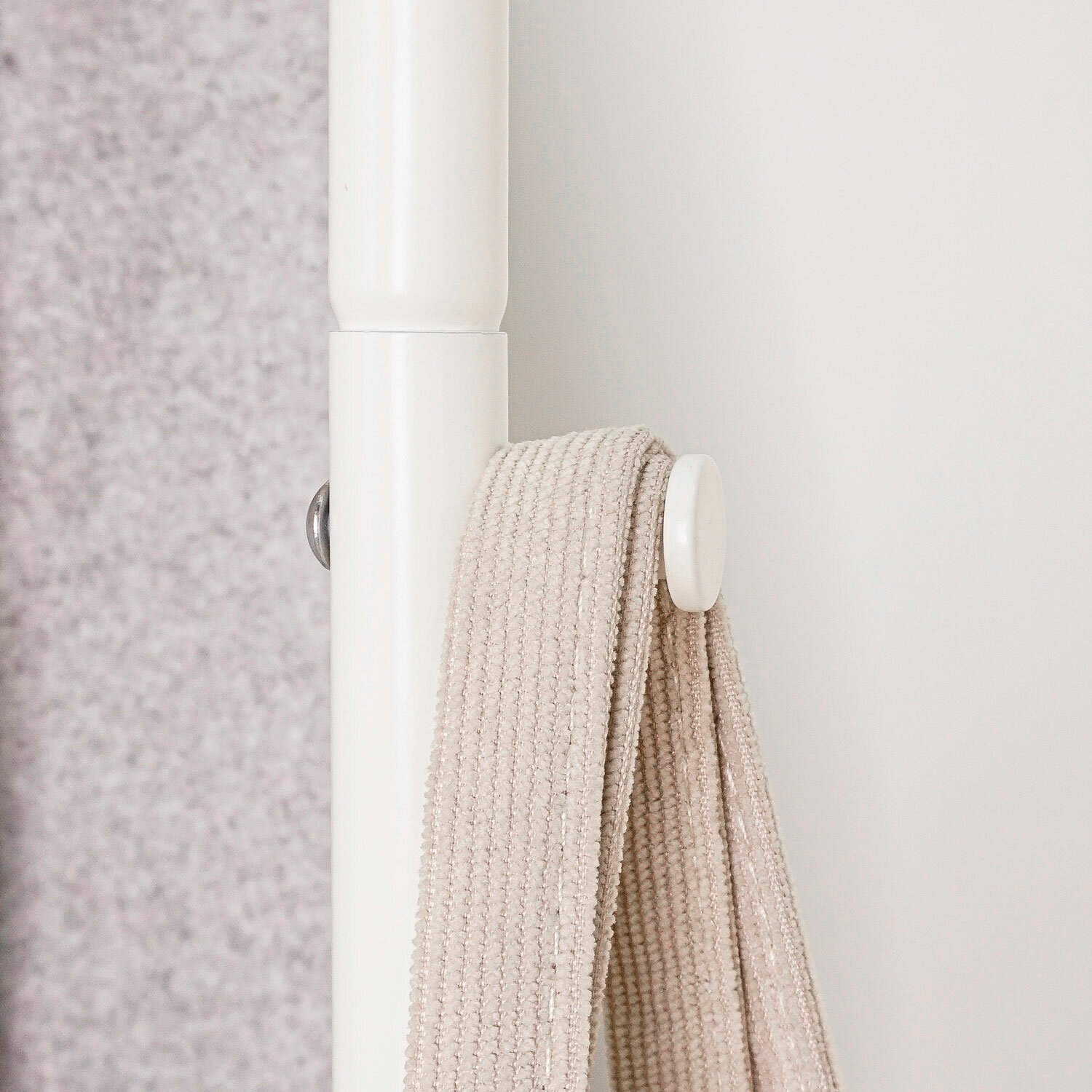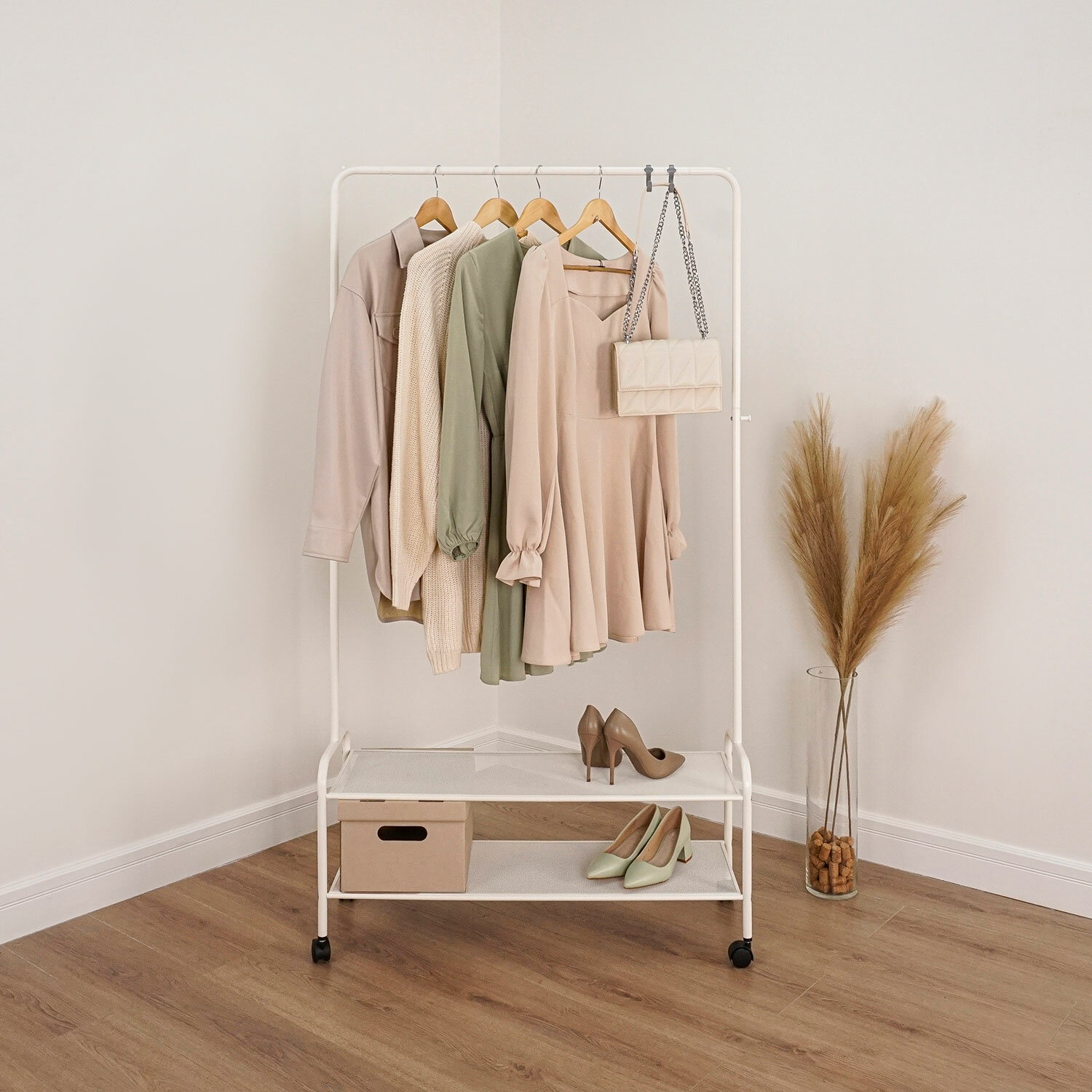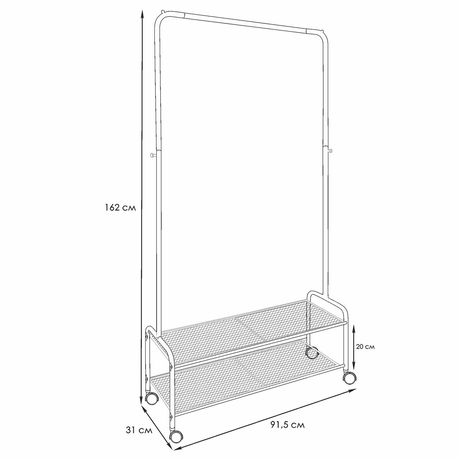 Каркас выполнен из стальной трубы диаметром 18 мм с полимерным покрытием.Железная перекладина вмещает от 15 до 20 плечиков, распределенная нагрузка — до 20 кг.Перекладина оснащена ограничителями, предотвращающими соскальзывание плечиков.Два стационарных крючка и один съемный декоративный крючок для аксессуаров.Две полки для размещения обуви, коробок или органайзеров, распределенная нагрузка на полку — до 8 кг.На ножках предусмотрены пластиковые поворотные роликовые опоры.Изделие поставляется в разобранном виде в красочной картонной коробке с ручкой.Простая сборка согласно инструкции, шестигранный ключ в комплекте.