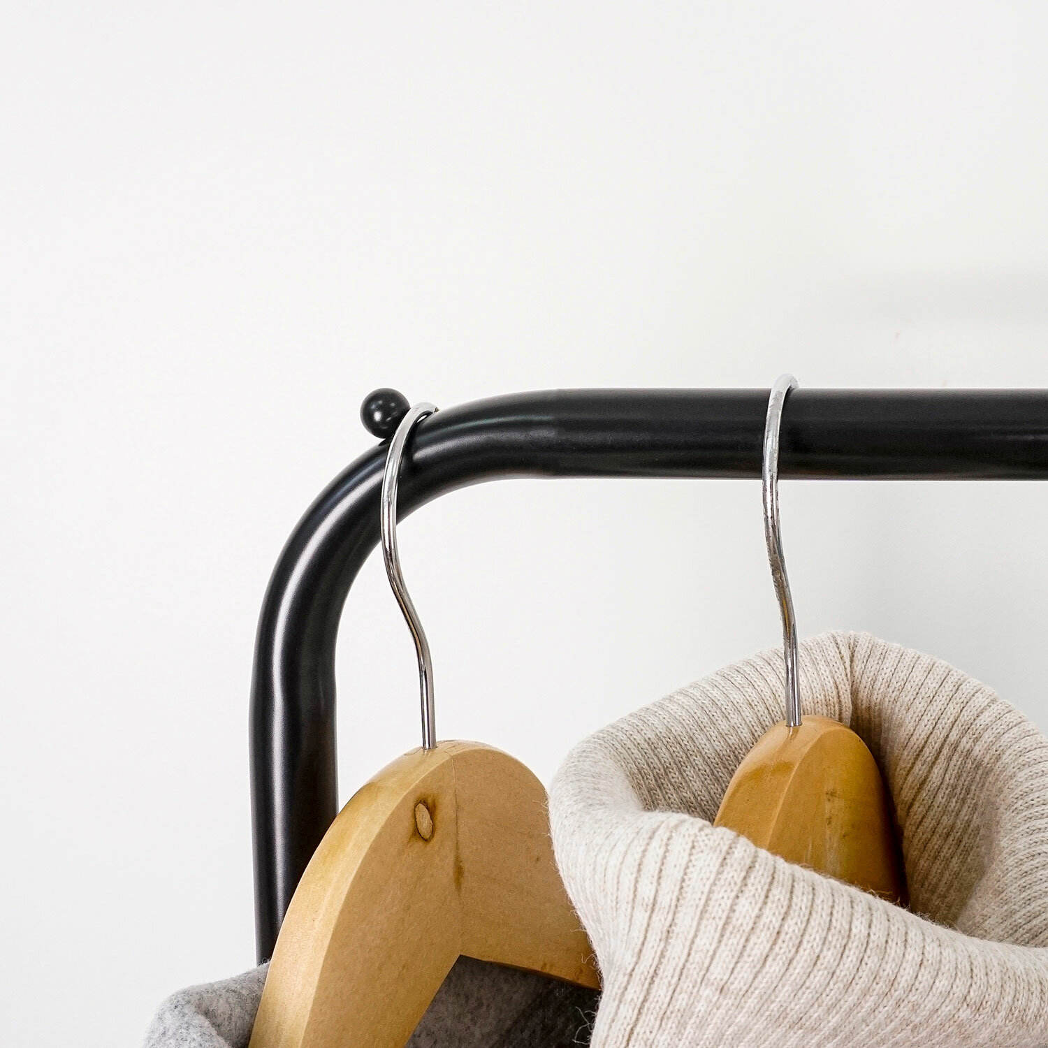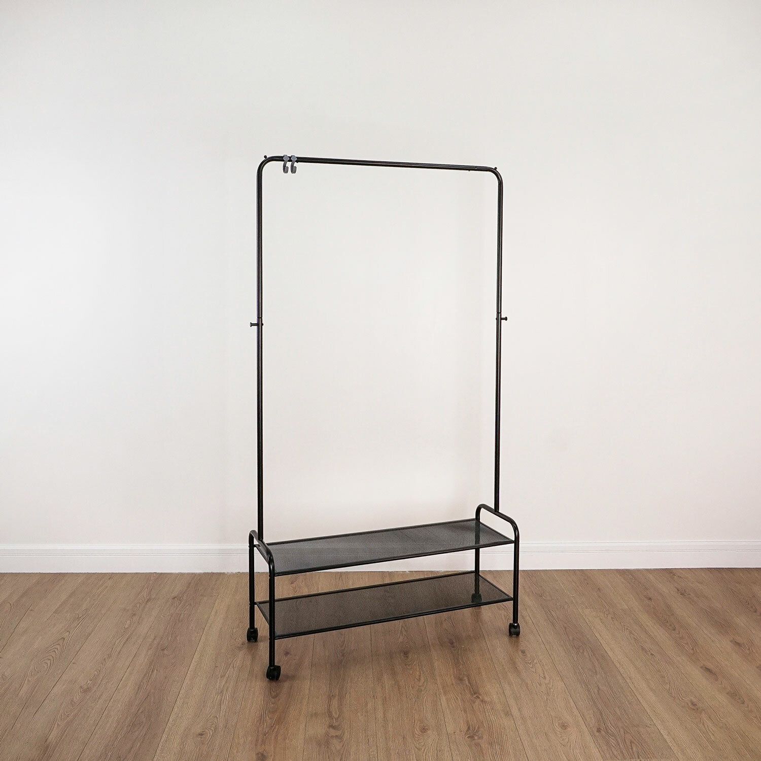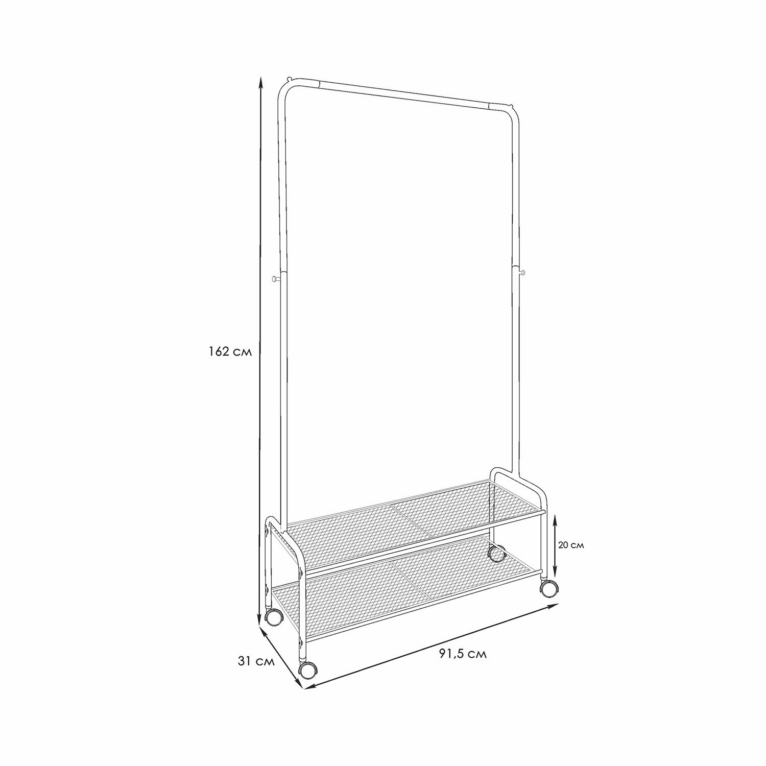 Каркас выполнен из стальной трубы диаметром 18 мм с полимерным покрытием.Железная перекладина вмещает от 15 до 20 плечиков, распределенная нагрузка — до 20 кг.Перекладина оснащена ограничителями, предотвращающими соскальзывание плечиков.Два стационарных крючка и один съемный декоративный крючок для аксессуаров.Две полки для размещения обуви, коробок или органайзеров, распределенная нагрузка на полку — до 8 кг.На ножках предусмотрены пластиковые поворотные роликовые опоры.Изделие поставляется в разобранном виде в красочной картонной коробке с ручкой.Простая сборка согласно инструкции, шестигранный ключ в комплекте.