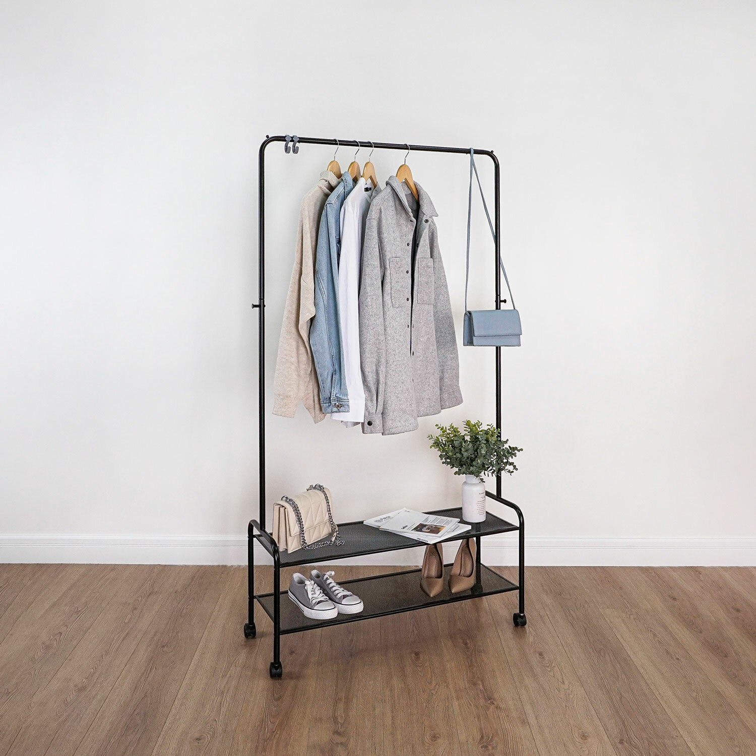 Многофункциональная мобильная вешалка для открытого хранения вещей дома, в офисе и зале магазина. Это не просто вешалка, это гардеробная система со штангой для плечиков, полкой для обуви и органайзеров, крючками для сумок, зонтов и других аксессуаров.