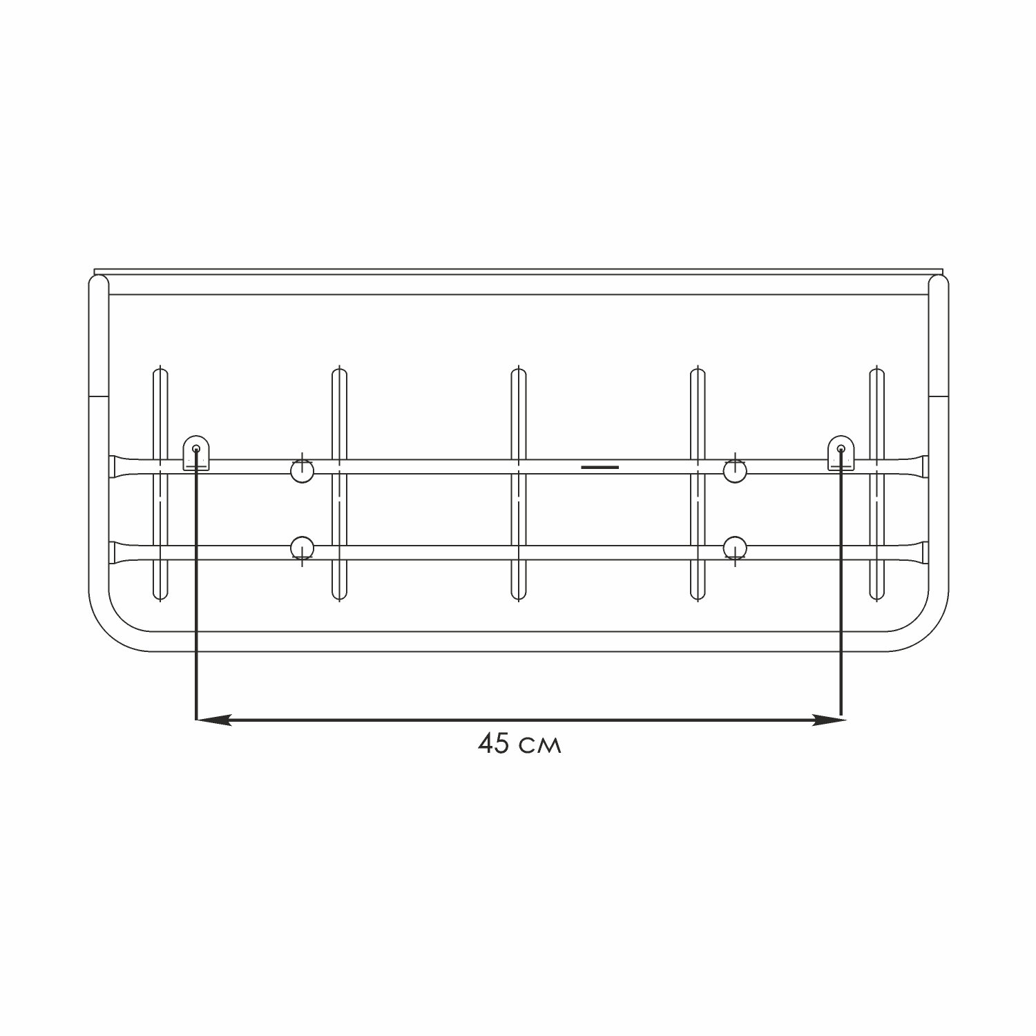 Прочный каркас из металлических труб.Пять двойных крючков с защитными пластиковыми колпачками.Допустимая нагрузка на крючок – до 5 кг.Удобная полка для головных уборов.Дополнительный пластиковый крючок для мелочей.Изделие поставляется в разобранном виде в картонной коробке с ручкой.Простая сборка, без применения инструментов.Крепеж к стене не входит в комплект фурнитуры!