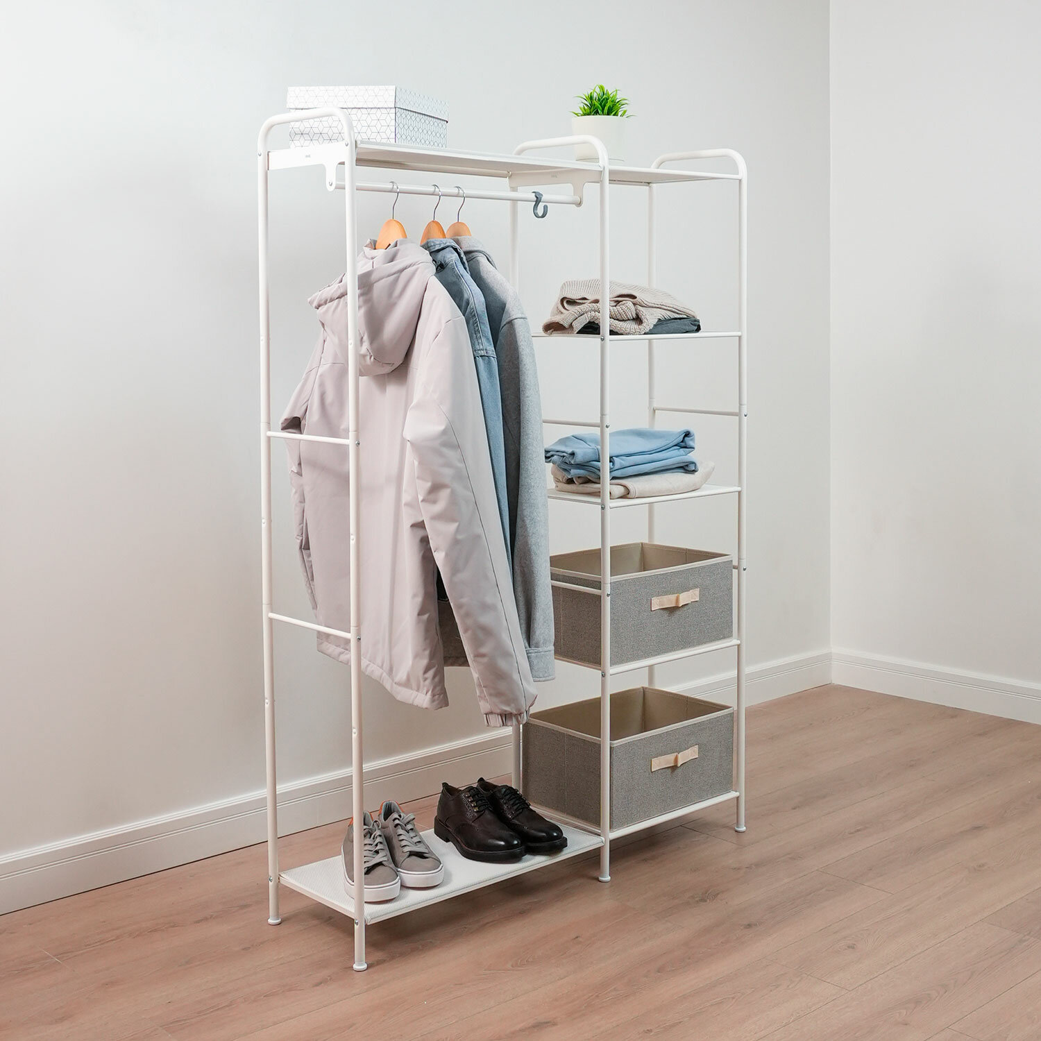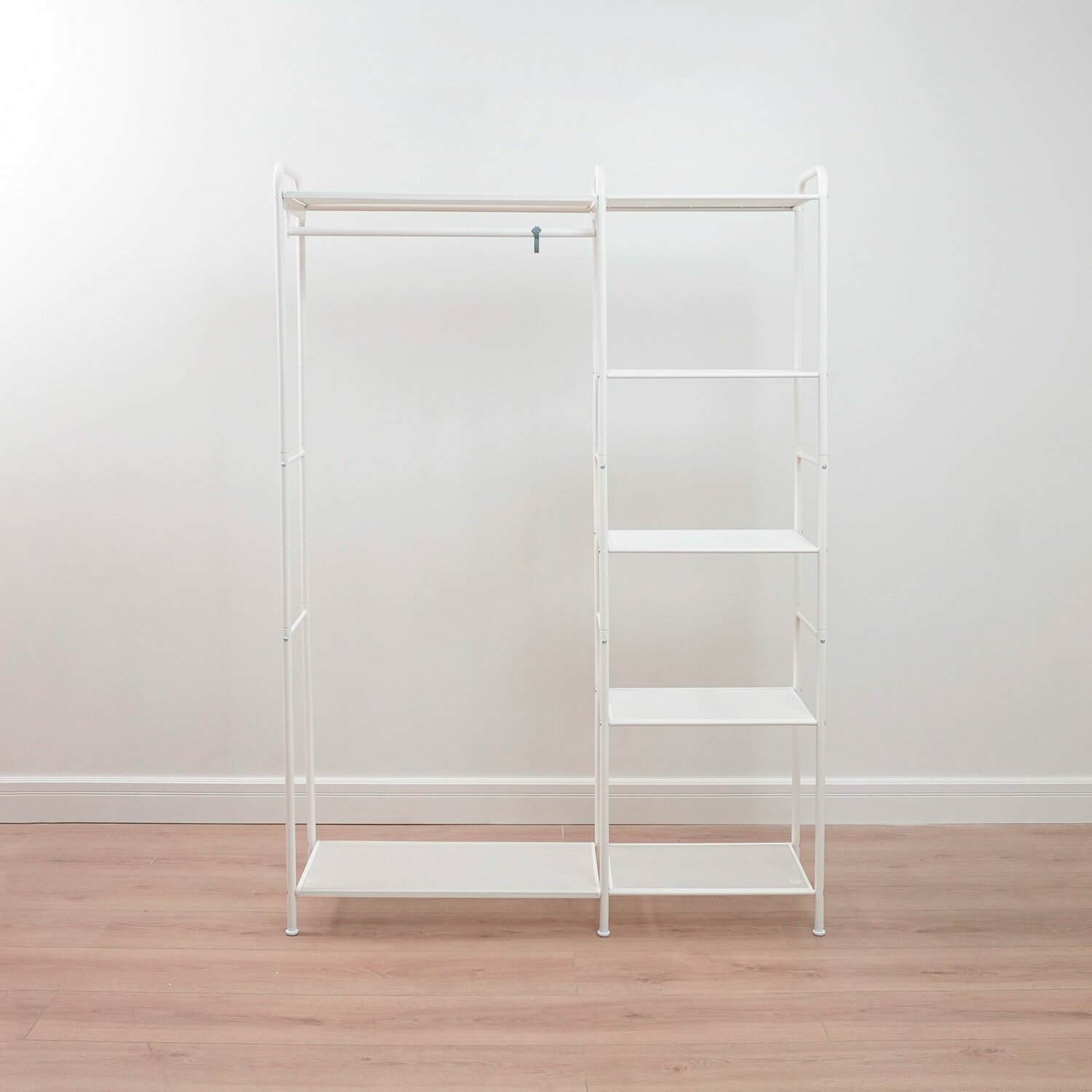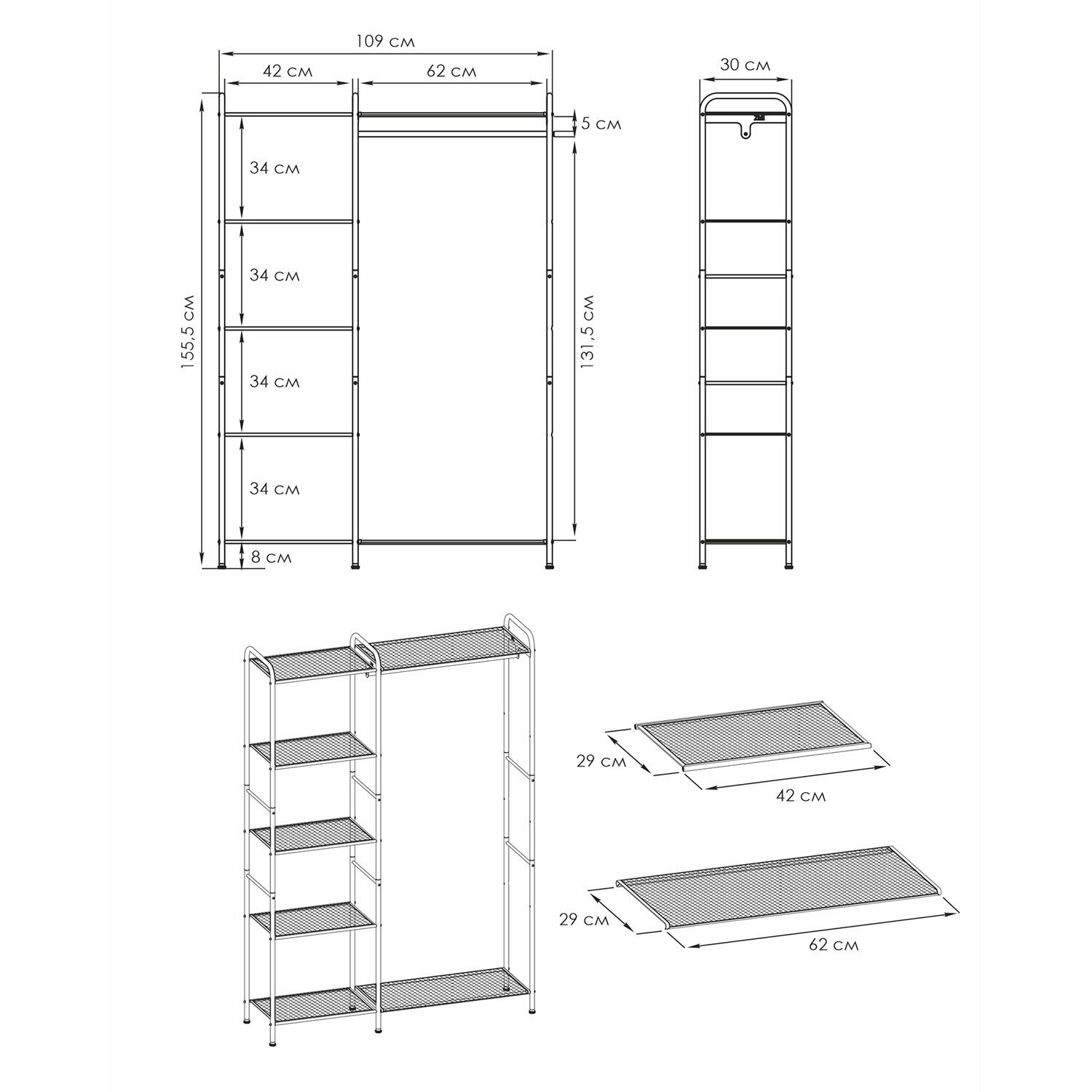 Стеллаж выполнен из прочной металлической трубы диаметром 18 мм и стального листа в мелкую сетку.Железная перекладина способна разместить от 10 до 15 плечиков, распределенная нагрузка — до 20 кг.Семь прочных металлических полок, распределенная нагрузка на полку — до 8 кг.Нагрузка на одну полку – до 8 кг.Два пластиковых декоратевных крючка для мелочей.На ножках установлены пластиковые регулируемые опоры.Предусмотрено надежное крепление к стене.Изделие поставляется в разобранном виде в картонной коробке с ручкой.Простая сборка согласно инструкции, шестигранный ключ для сборки в комплекте.