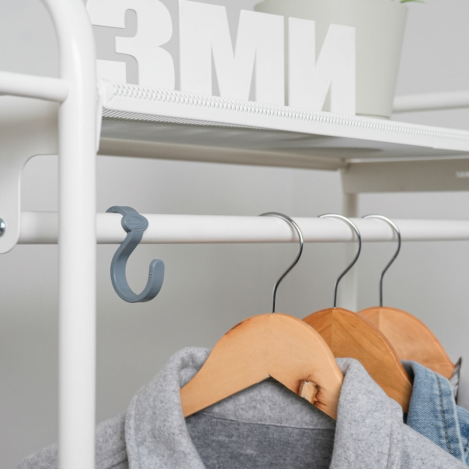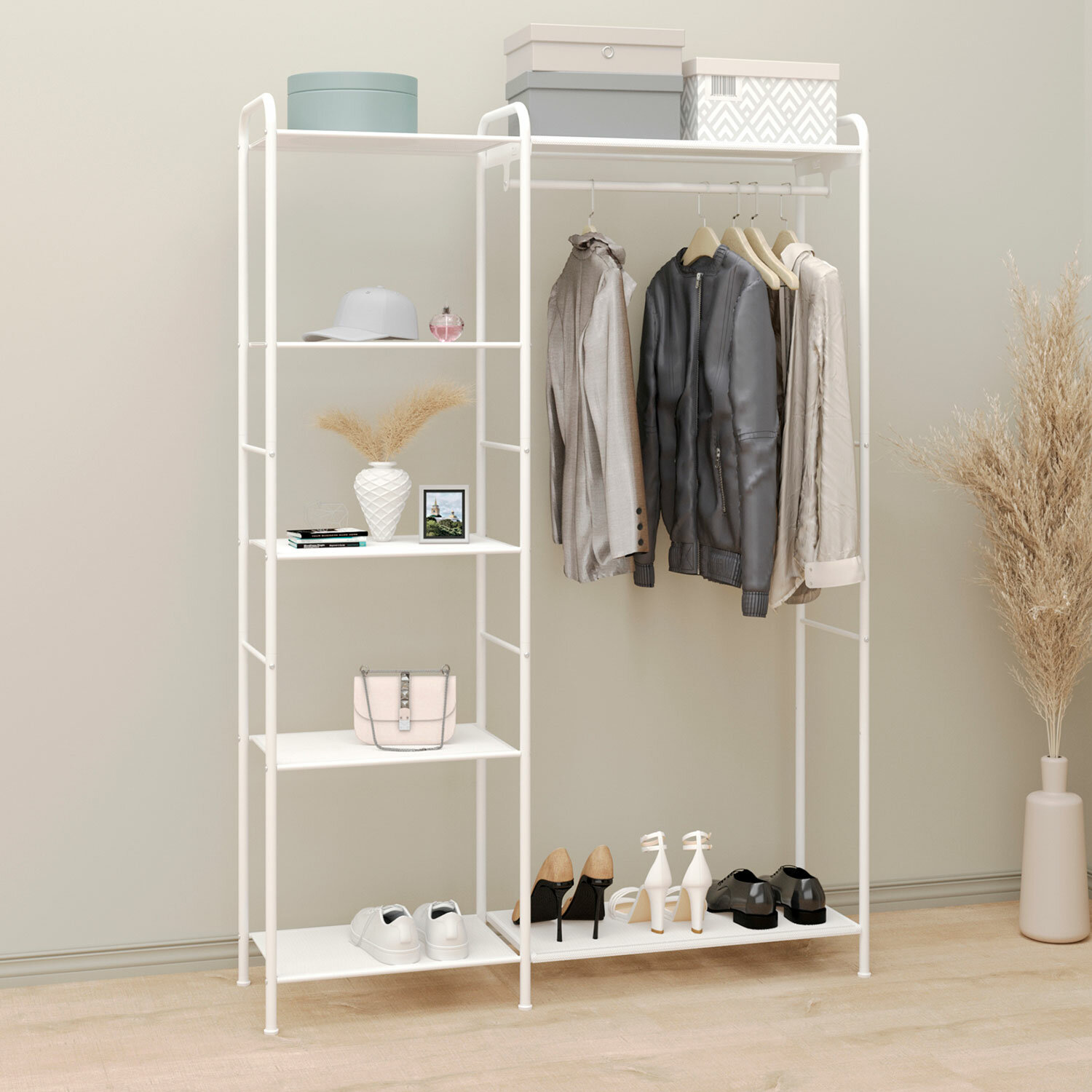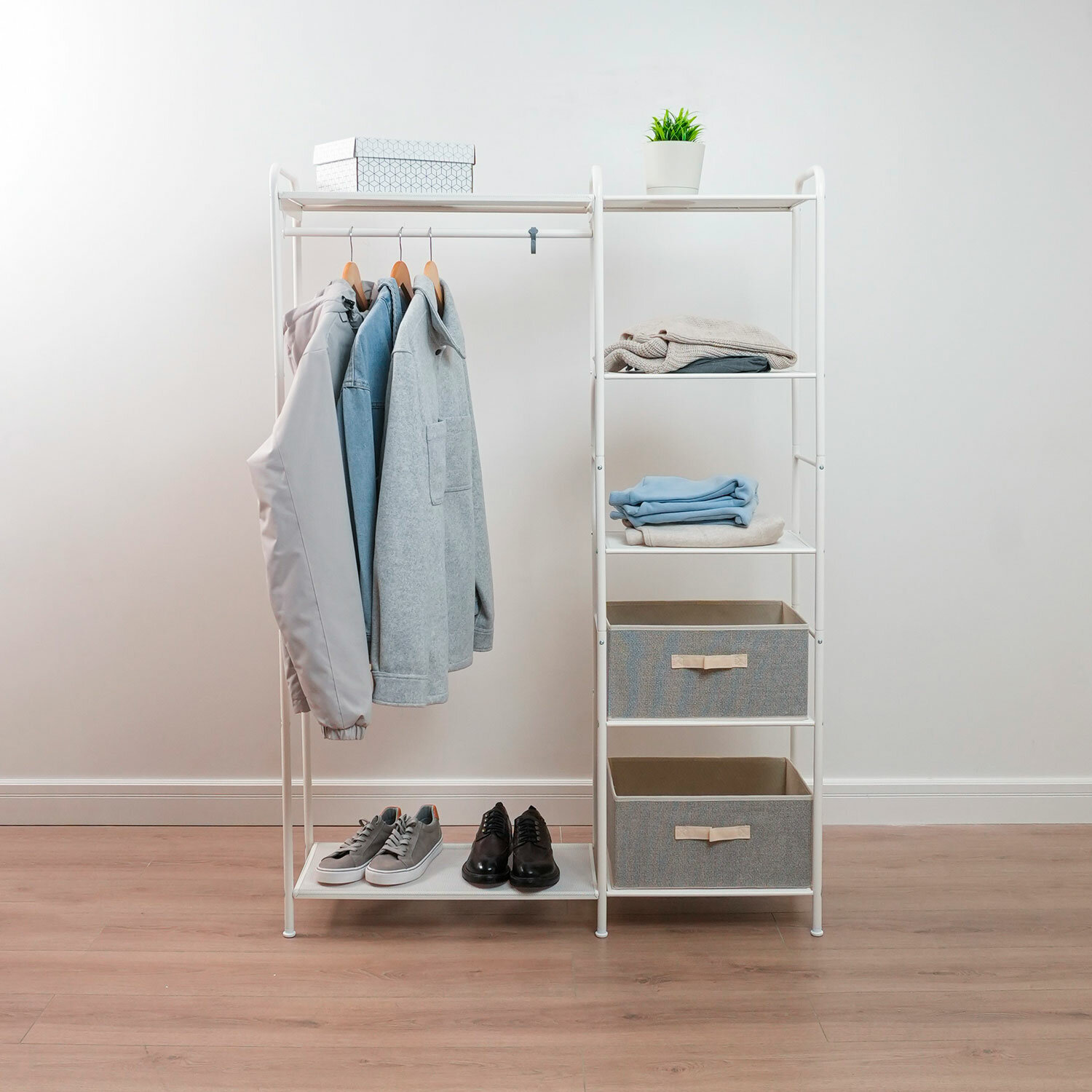 Стеллаж выполнен из прочной металлической трубы диаметром 18 мм и стального листа в мелкую сетку.Железная перекладина способна разместить от 10 до 15 плечиков, распределенная нагрузка — до 20 кг.Семь прочных металлических полок, распределенная нагрузка на полку — до 8 кг.Нагрузка на одну полку – до 8 кг.Два пластиковых декоратевных крючка для мелочей.На ножках установлены пластиковые регулируемые опоры.Предусмотрено надежное крепление к стене.Изделие поставляется в разобранном виде в картонной коробке с ручкой.Простая сборка согласно инструкции, шестигранный ключ для сборки в комплекте.
