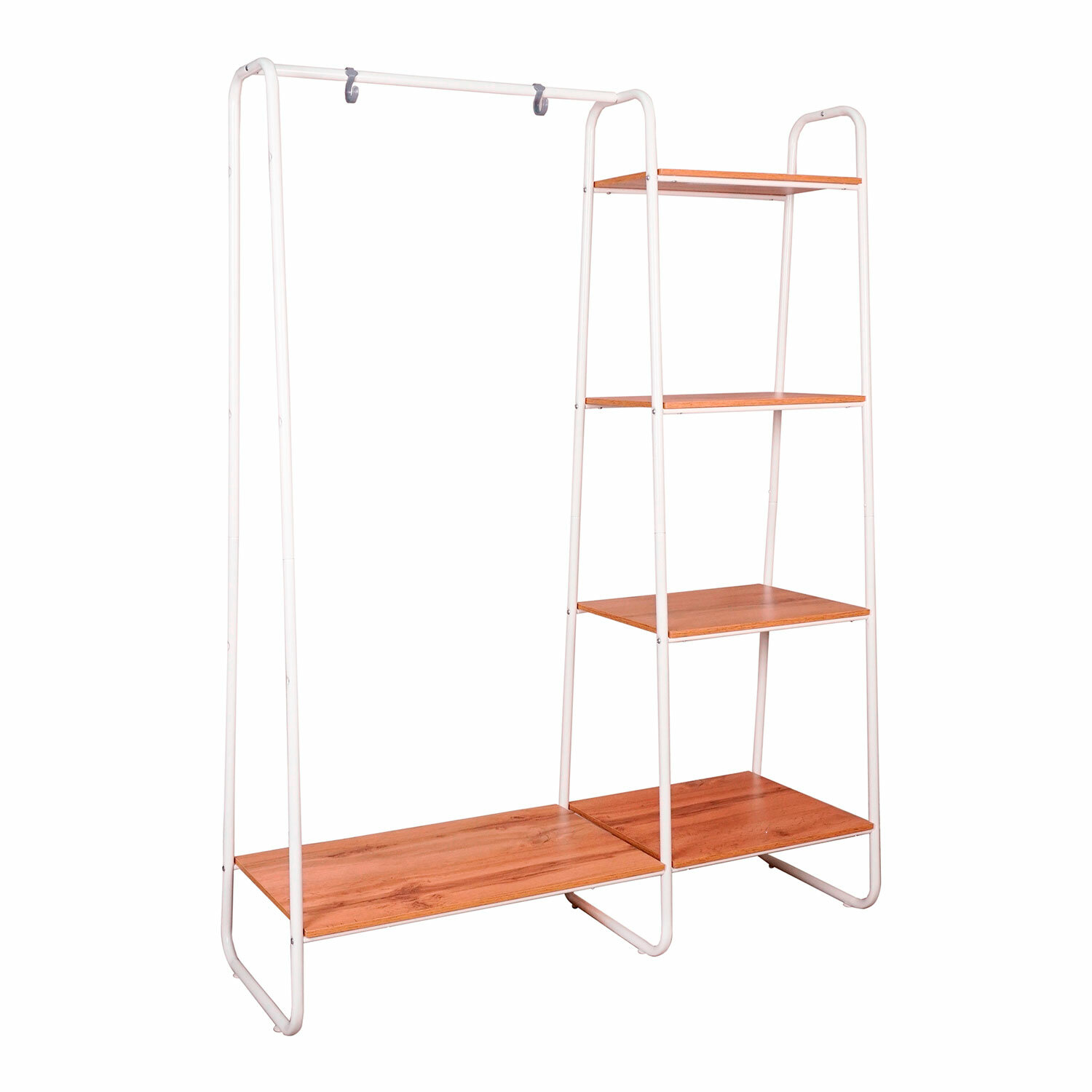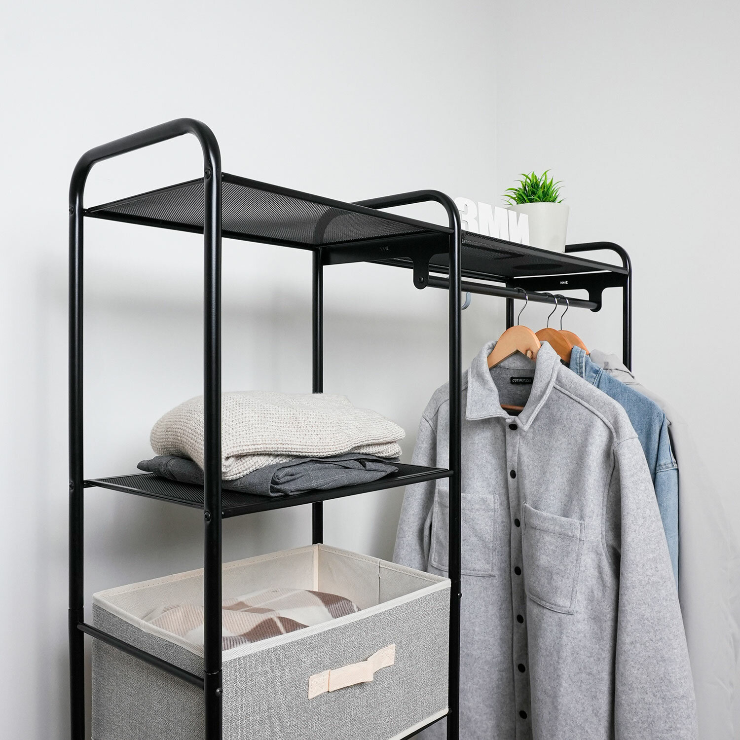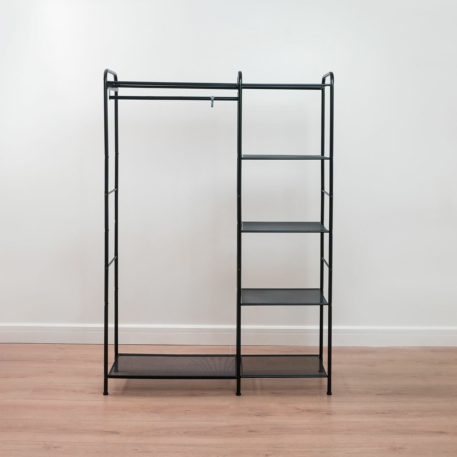 Стеллаж выполнен из прочной металлической трубы диаметром 18 мм и стального листа в мелкую сетку.Железная перекладина способна разместить от 10 до 15 плечиков, распределенная нагрузка — до 20 кг.Семь прочных металлических полок, распределенная нагрузка на полку — до 8 кг.Нагрузка на одну полку – до 8 кг.Два пластиковых декоратевных крючка для мелочей.На ножках установлены пластиковые регулируемые опоры.Предусмотрено надежное крепление к стене.Изделие поставляется в разобранном виде в картонной коробке с ручкой.Простая сборка согласно инструкции, шестигранный ключ для сборки в комплекте.
