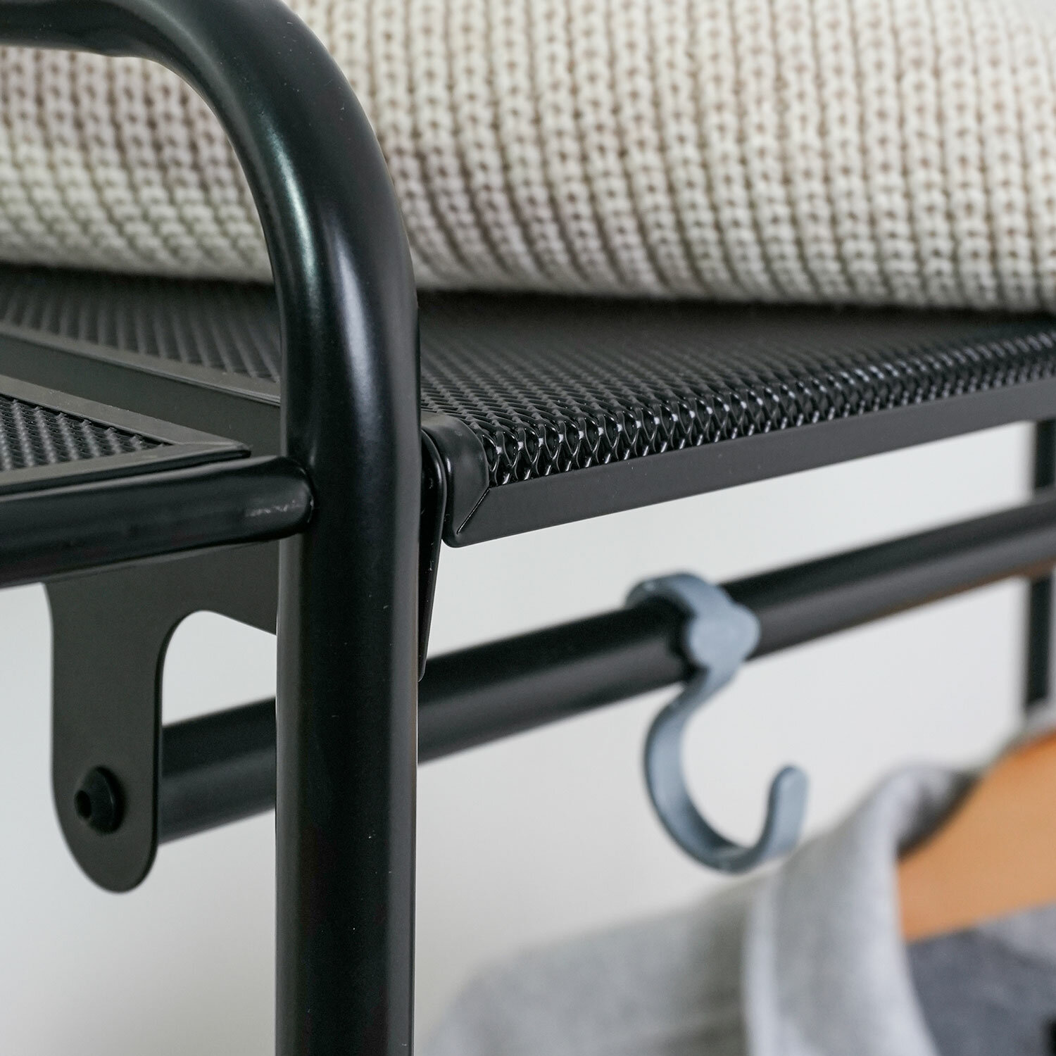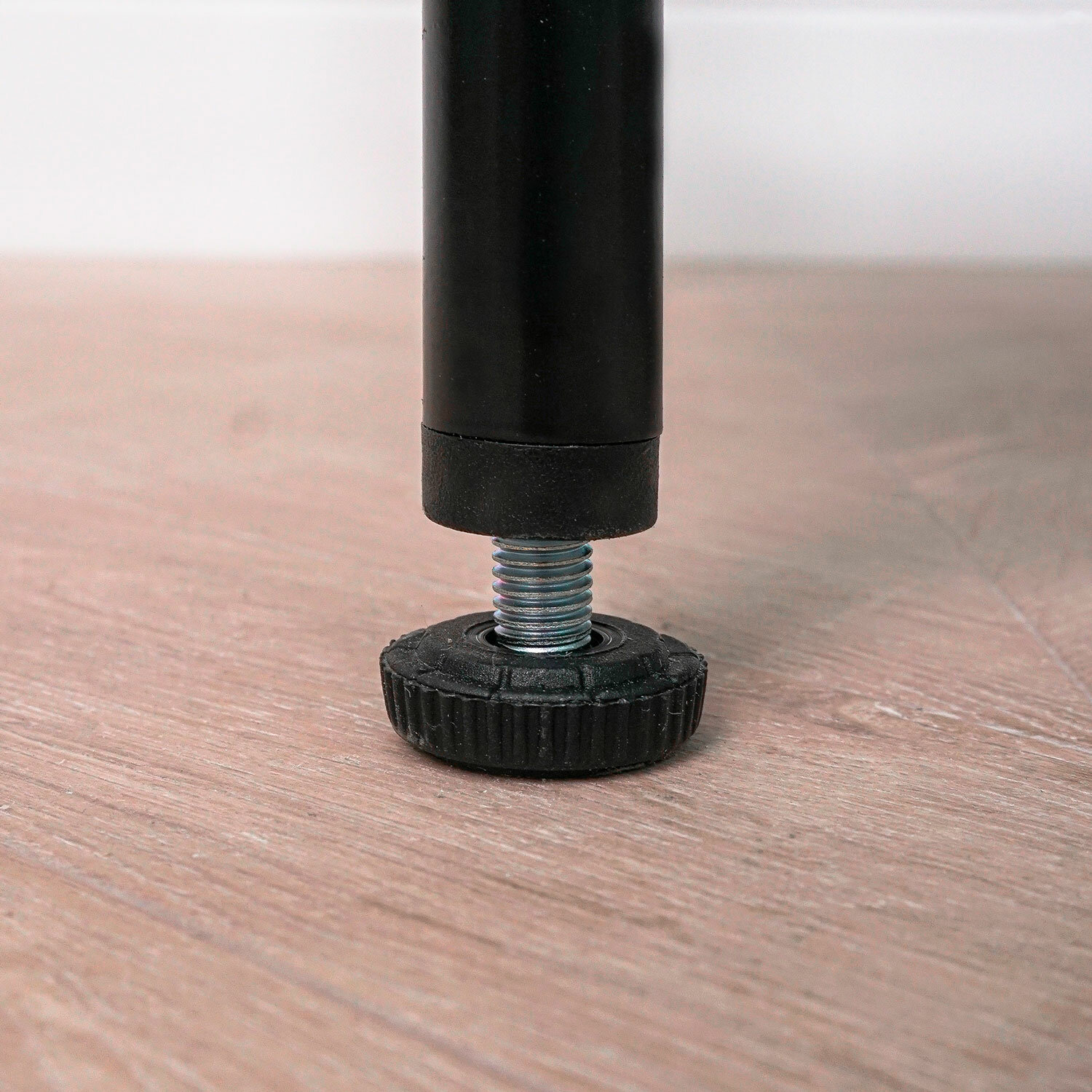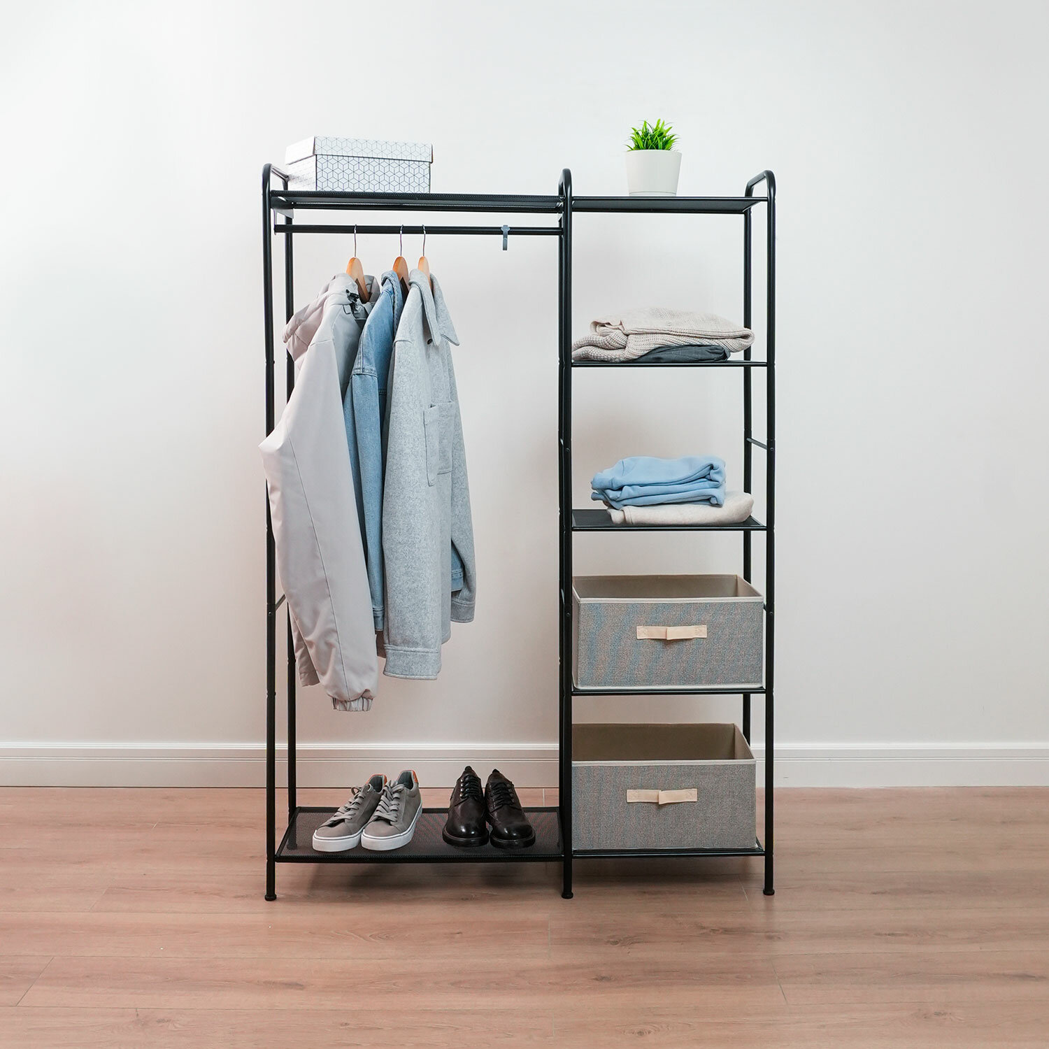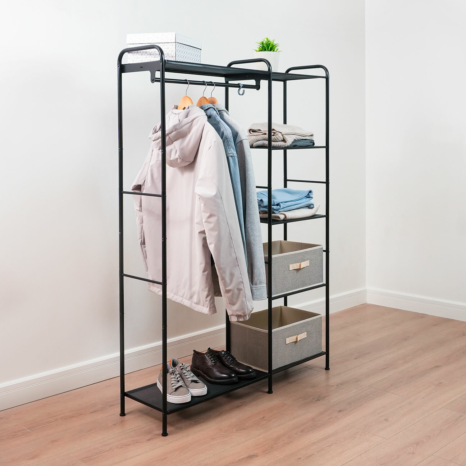 Стеллаж выполнен из прочной металлической трубы диаметром 18 мм и стального листа в мелкую сетку.Железная перекладина способна разместить от 10 до 15 плечиков, распределенная нагрузка — до 20 кг.Семь прочных металлических полок, распределенная нагрузка на полку — до 8 кг.Нагрузка на одну полку – до 8 кг.Два пластиковых декоратевных крючка для мелочей.На ножках установлены пластиковые регулируемые опоры.Предусмотрено надежное крепление к стене.Изделие поставляется в разобранном виде в картонной коробке с ручкой.Простая сборка согласно инструкции, шестигранный ключ для сборки в комплекте.