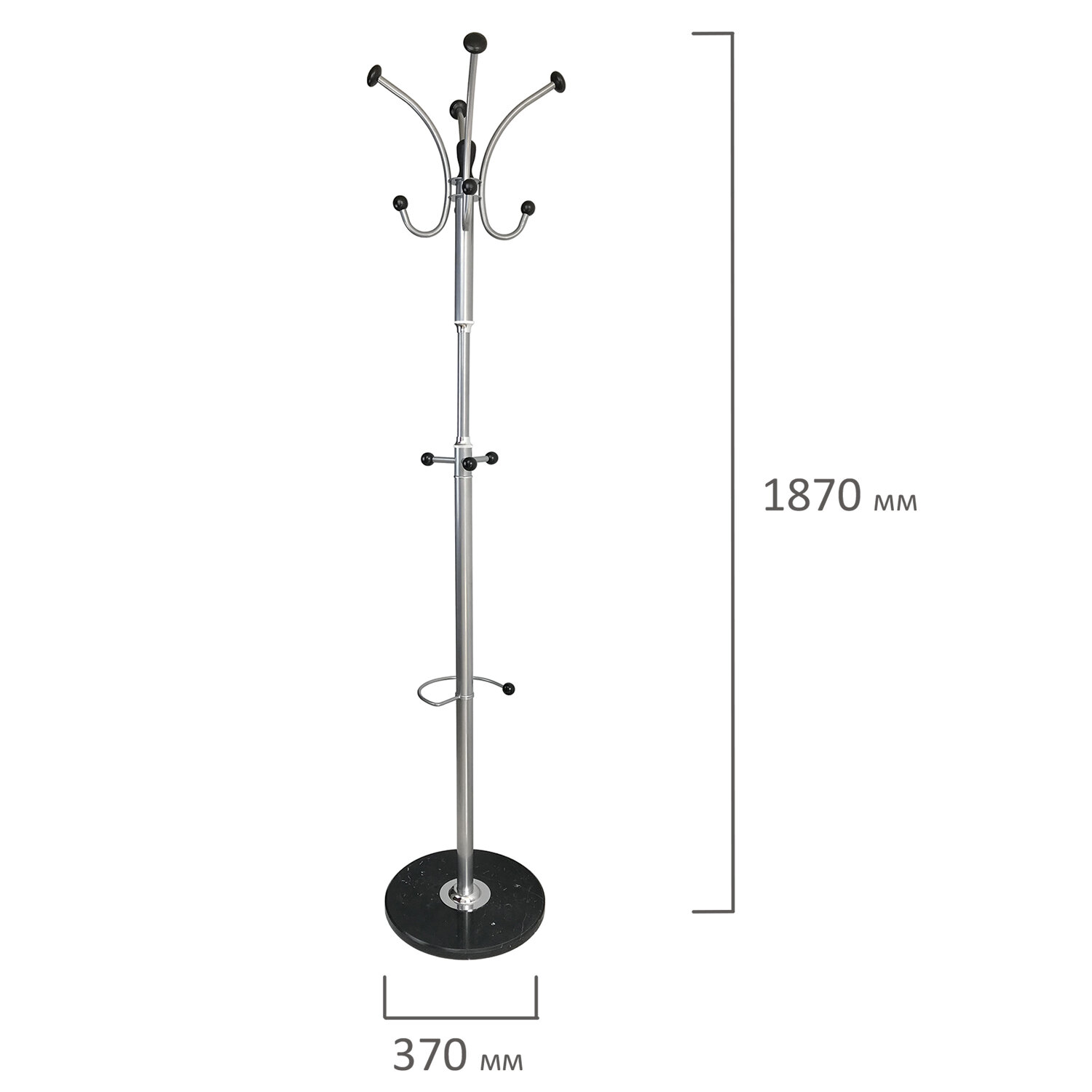 Оснащена четырьмя прочными металлическими крючками для головных уборов и верхней одежды, способных выдержать общую нагрузку до 10 кг.Также есть три дополнительных крючка для сумок.Бесспорное преимущество данной модели — основание из натурального мрамора, которое не только делает дизайн каждой вешалки особенным, но обеспечивает высококлассную устойчивость. Дополнительно вешалка-стойка оснащена крючком для зонтов.Комплект поставляется в разобранном виде. Размер — 1870х370х370 мм.