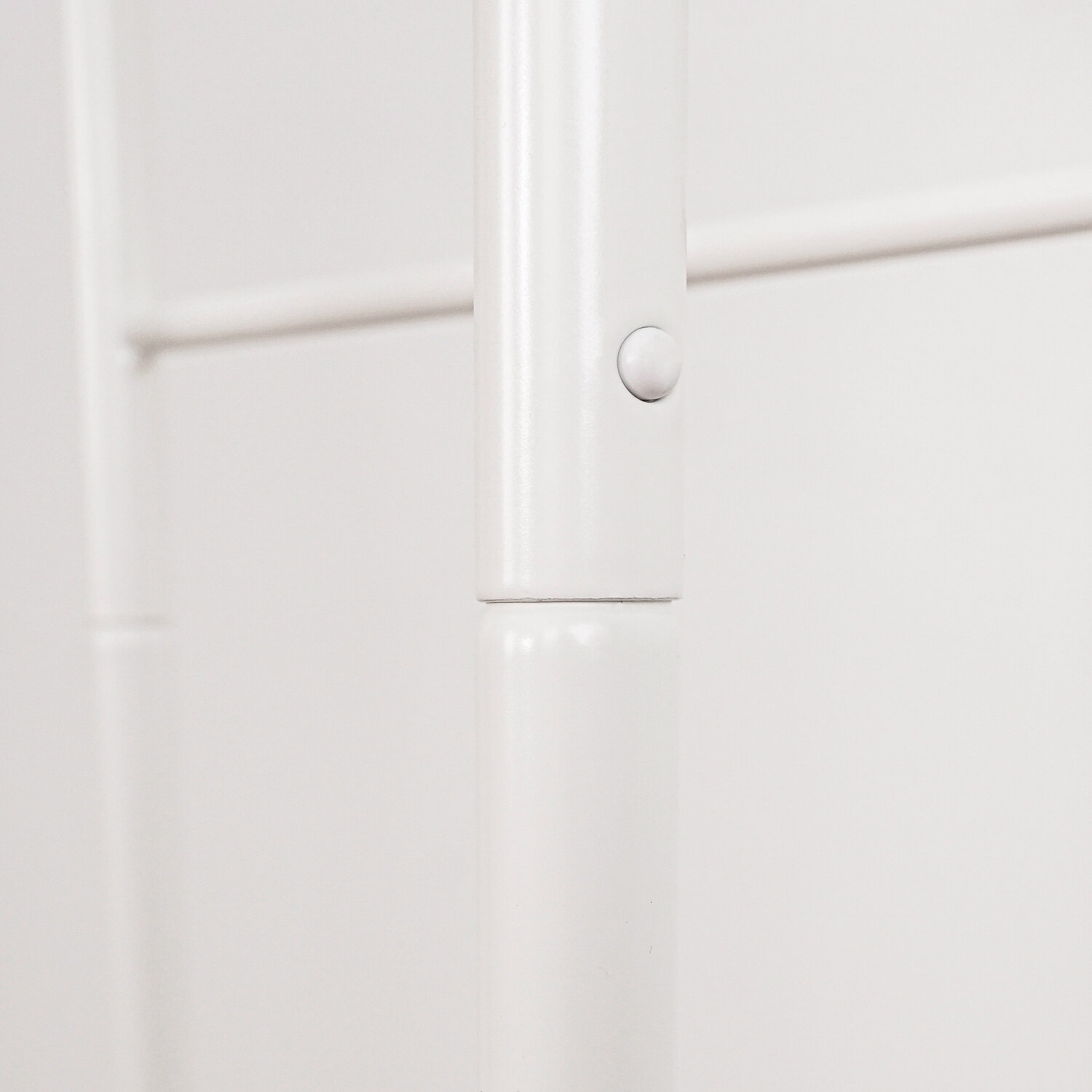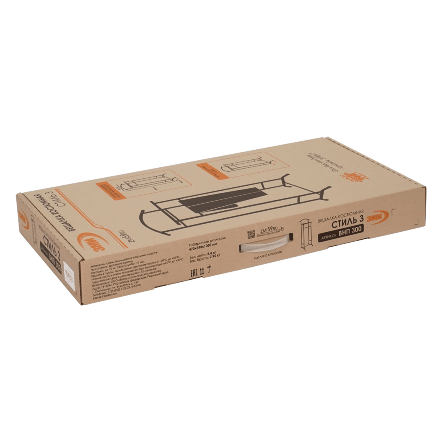 Прочный каркас изготовлен из металлической трубы диаметром 18 мм.Оснащена плечиками и 3 штангами для одежды.На ножках предусмотрены заглушки, защищающие пол от повреждения.Общая нагрузка – до 10 кг.Изделие поставляется в разобранном виде в картонной коробке с ручкой.Простая сборка согласно инструкции, шестигранный ключ в комплекте.